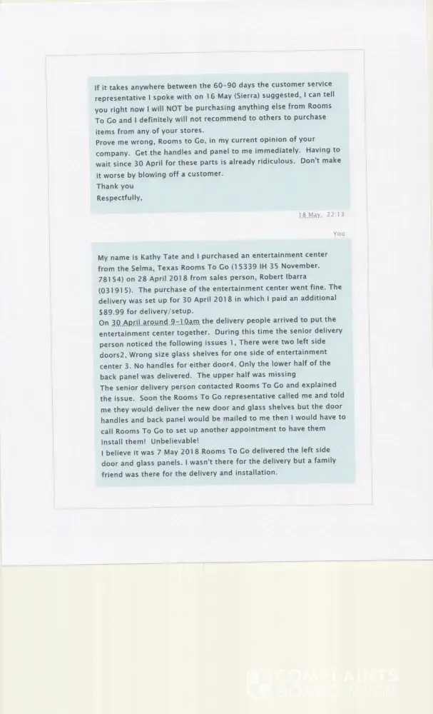 Desired Resolution: I want my door handles and back wall panel immediately and I'd like partial repayment for the $89.99 I paid to have the entertainment center put together.