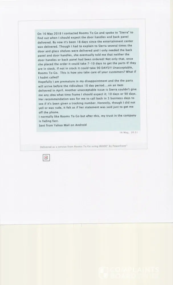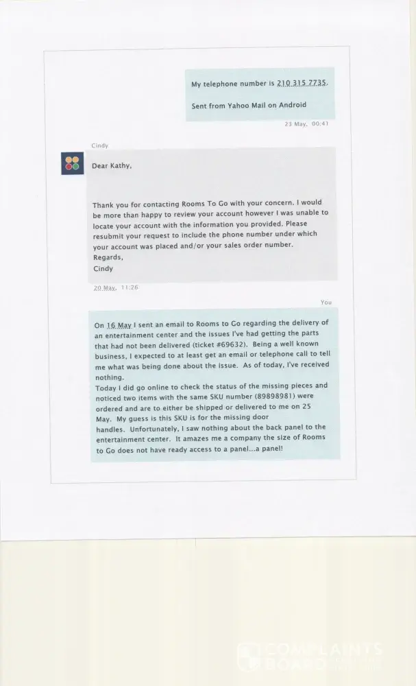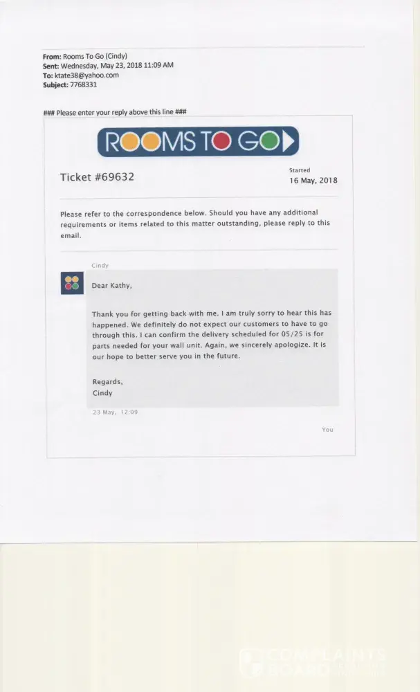 On 16 May I sent RTG an email on what I'd experienced. I received no reply. I sent another email to RTG on 18 May in which a representative named "Cindy" finally contacted me, by email. On 23 May she sent me an email that stated, in short, "I can confirm the delivery scheduled for 5/25 is for parts needed for your wall unit."