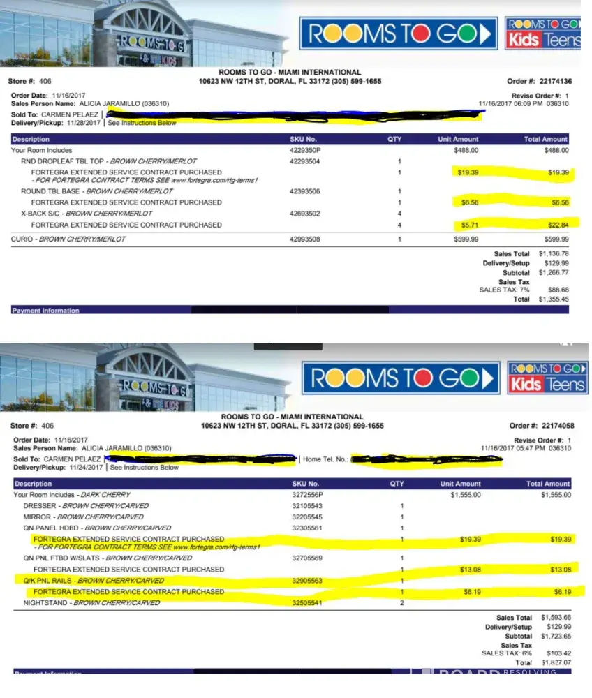 order: [protected] & [protected] / bedroom set & dining set (insurance added without authorization)