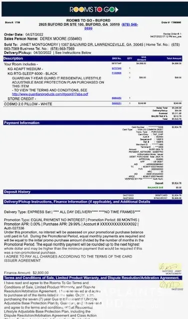 I had called in to try and use the warranty and my claim was denied 9.15.21 per their records with guardian, however, rooms to go customer service care center told me if I was due any money back it would be through guardian not the rooms to go company. I shall file this with the let us know email @ [protected]@RoomsToGo.com.