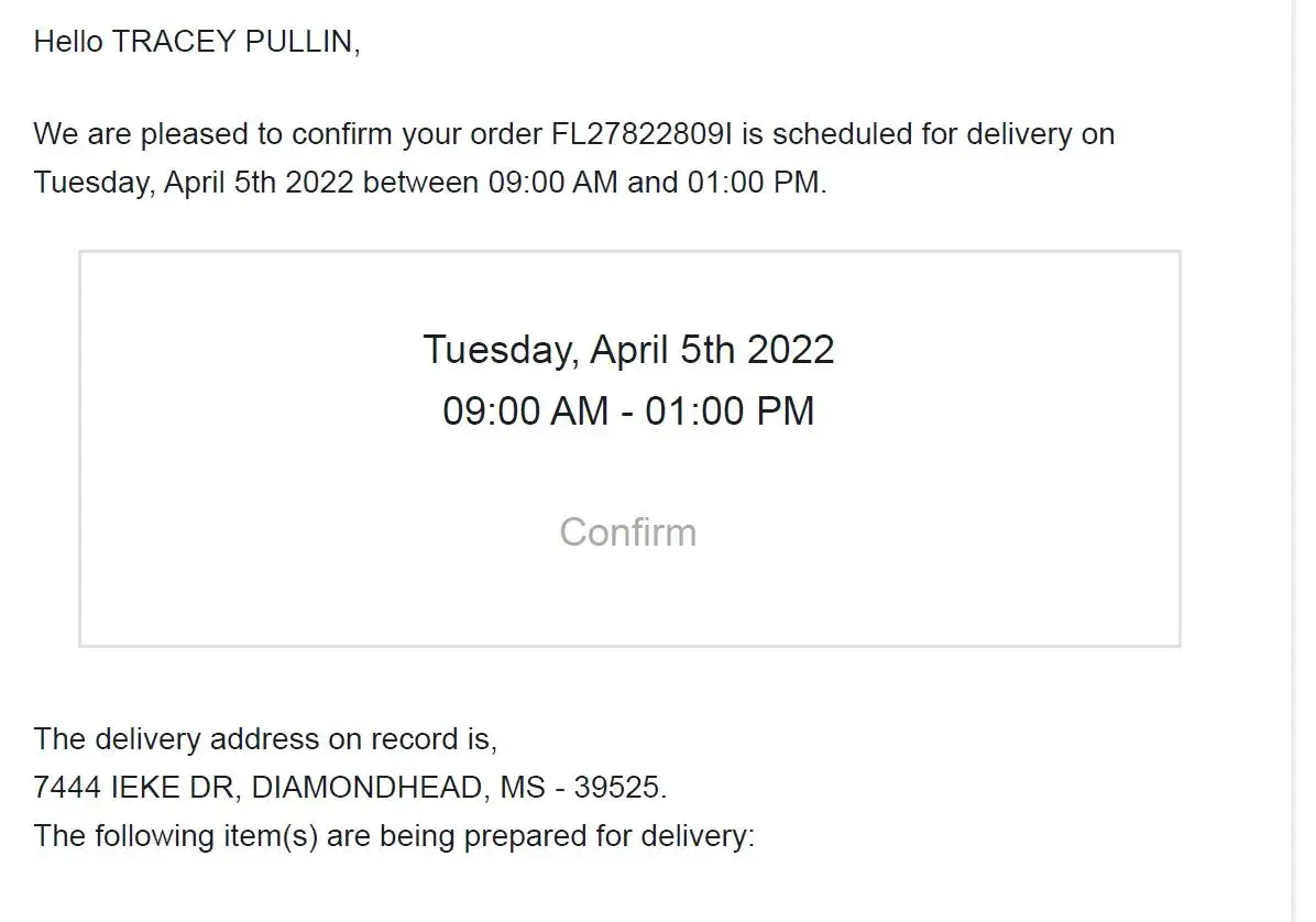 We ordered a bedroom set on the first day of the sale that started March 6, 2023. We found the offer online but soon were connected with a sales person who was to help us. He had indicated we needed to make a payment at that time to secure the stock which we did. Later that day he indicated we needed to pay in full to secure the stock which we did. He said he would talk with his manager right away who would make it happen. That never happened and the product delivered April 11.