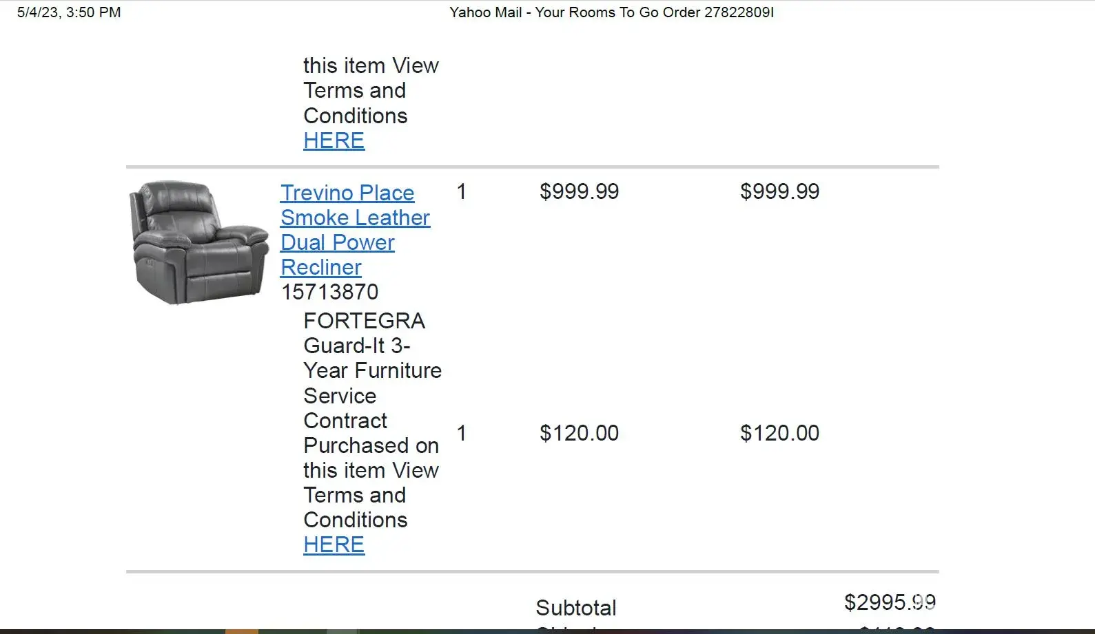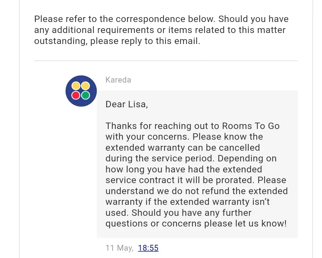 When I purchased a living room set and kitchen table set in 2020, I was told if I purchased a warranty with my furniture and didn't make a claim, or didn't have to use my warranty, I would be refunded the warranty cost back after 3 years. I called 5.11.2023 knowing my 3 years would be up 5.29.2023 and was told by Iisha in customer service Florida center, that was not the case, and her nor her manager had EVER heard of them offering that deal. She then proceeded to tell me it is like car insurance and if you dont use it you pay for it anyway with no money back. Oddly, I was just transferred from online sales within rooms to go online sales to her in customer service. The internet ordering department, and he used the exact verbage for my purchasing a warranty from them I would get it back after or jist before the 3 years is up, and insisted he transfer me to their customer care service to get it taken care of for me.