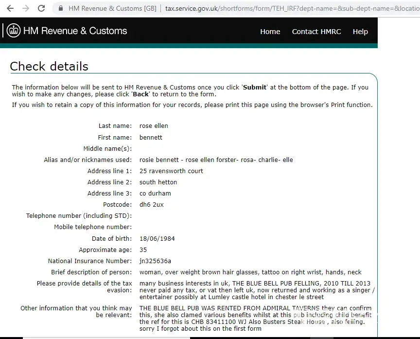 One matter which Rose Ellen Bennett cannot escape of course is UK tax evasion, today I have worked with the HMRC and provided all of the evidence they need to secure a prosecution for the wholesale tax fraud she carried out whilst running two pubs in the UK, it now transpires she never paid ONE PENNY in tax, vat, national insurance for herself or any employees, see the forms below which have been submitted to HMRC,