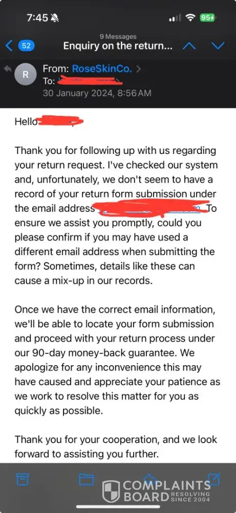I ordered a Lumi handset from RoseSkinCo on 23 November 2023, it arrived on 4 December 2023. I would like to return the item under the 90-day return policy due to dissatisfaction on the product and filled in the Satisfaction Guarantee Form on 23 January 2024. Then I received a confirmation email of the form submission, with a message of “Our team is on it – we’ll review your inquiry and a member of our team will get back to you within 48 hours.â€. However, I’ve waited for 3 days but there’s still no response from them. So I sent an email to info@roseskinco.com to check out the status of my return process.