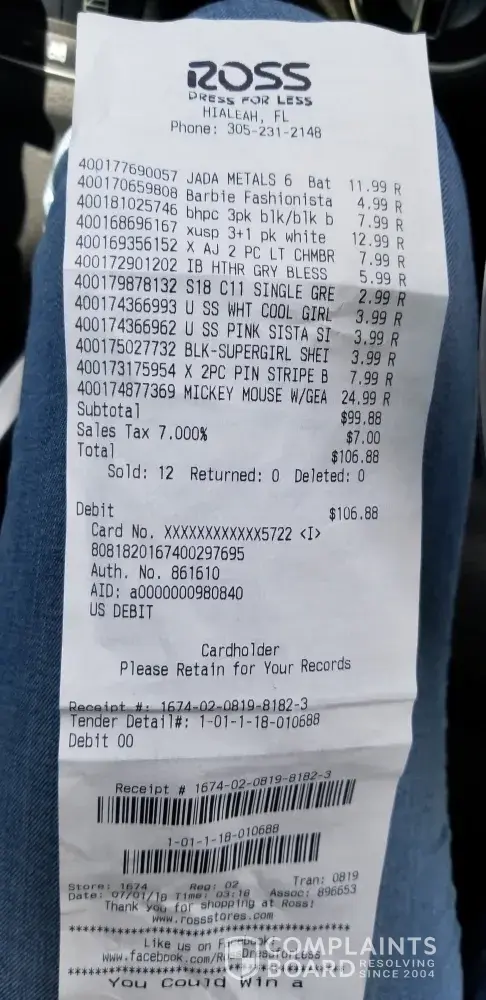 Bought a pair of women's Flojos Flip Flops on June 4th at the Ross located at River City Marketplace in Jax, Fl. A few weeks later, approx June 21 the right one came apart on the front. Had to glue it to be able to walk. Put them up...of course I did not keep receipt as I had my bank debit info on my bank app. Who would think a pair if Flip Flops would come apart. As I live 20+ miles from the nearest stor; brought them with me to the store in Yulee, Fl on Sun., 06/24. Could not exchange as I did not have a receipt. Once again you never expect Flip Flops, specially coming from Ross would last 17 days. Showing them my bank app where it shows my Ross purchase was not enough. I told them just to throw them away...and they do not need to sell low quality items. All in a very nice way. But honestly... I am never buying anything from Ross again. Tk.you.