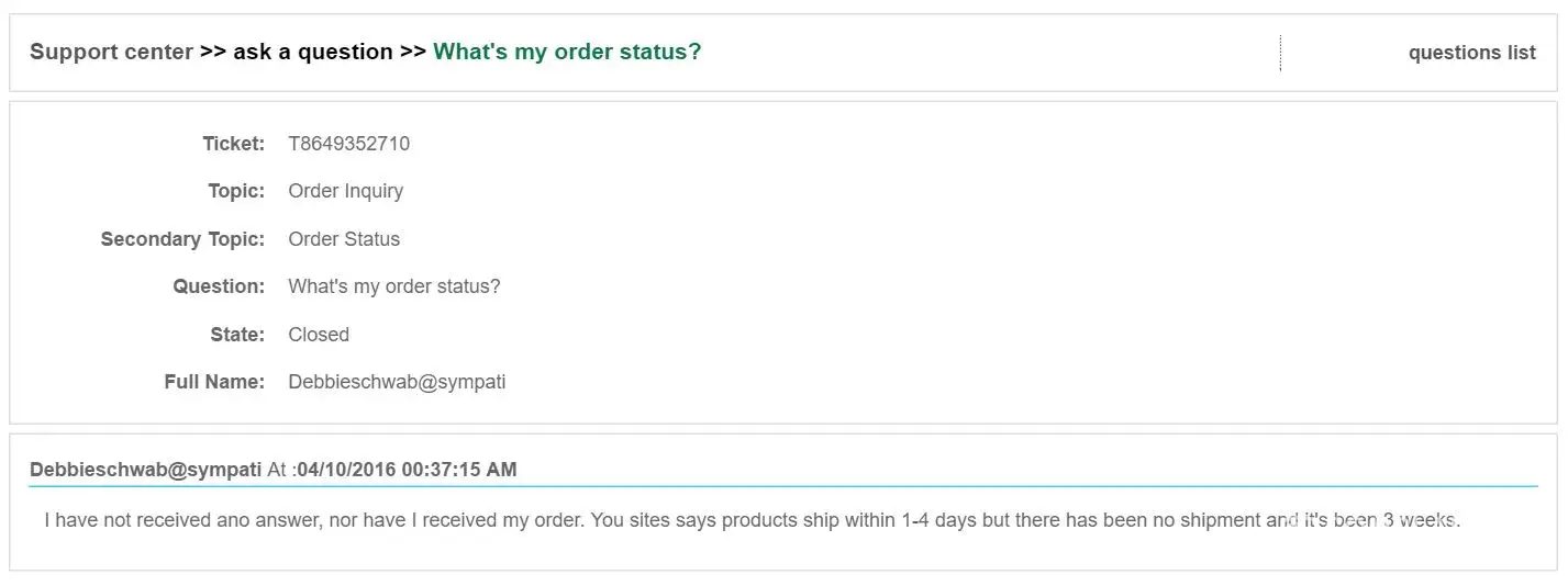 I placed an order on 4/6/16. I have sent in a few tickets regarding my order and asking for updates as to when the order would ship. Their website showed order would ship in 1-4 business days. Here we are 13 days later and still no product and no response from "customer service". I am at the point where I just want my money refunded to me and to be done with this whole thing. I wish I never ordered from here. This has been the worse on-line ordering experience in my life.