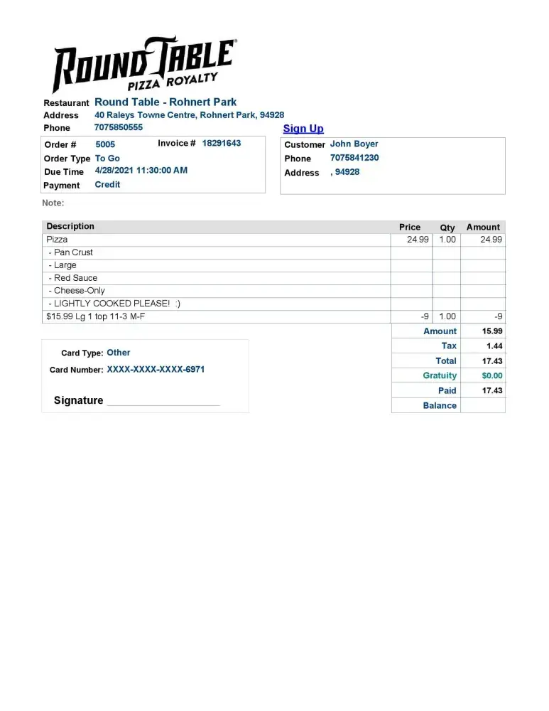Round Table Pizza Earning points