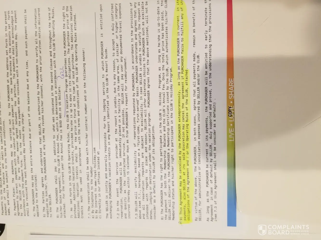 The paragraph writes "This agreement may be cancelled by the PURCHASER extemporaneously, as long as the PURCHASER is current in its payments, also SELLER at its sole discretion may cancel the agreement if PURCHASER fails to fulfill any of its obligations of the Agreement and/or the Operating Rules of the CLUB's holiday program." this 1st paragraph was marked by their rep with an asterisk. Now we know it was just to handle our objection if it comes to any trouble in cancellation. At the scene, they had their sales person, the leader of the sales person, and a legal representative who might be trained long time and placed in the scene to close any deal.