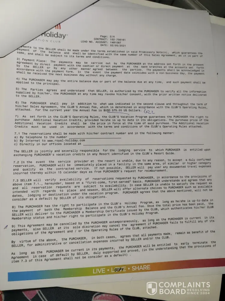 Update. To this date Royal Holiday Vacation Club has not contacted me and has made no effort to discuss this further. The worst customer service you will encounter and this is absolutely a buyer beware situation