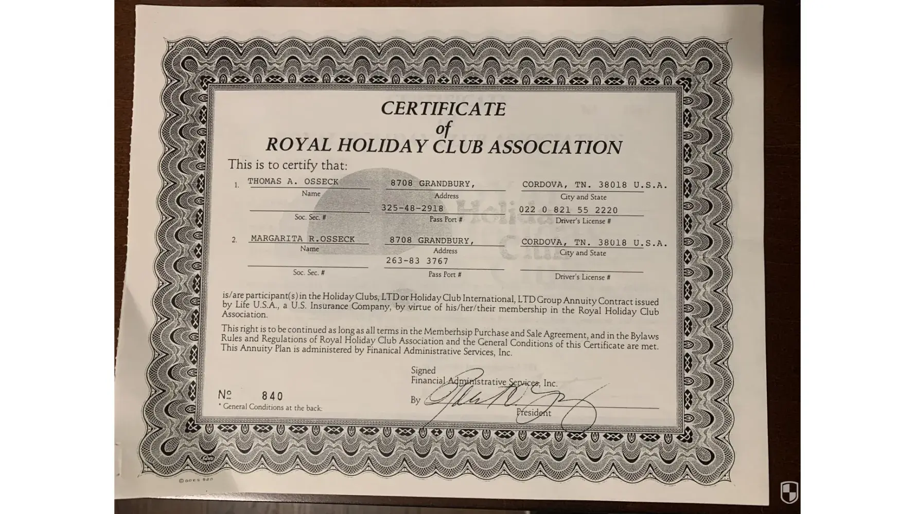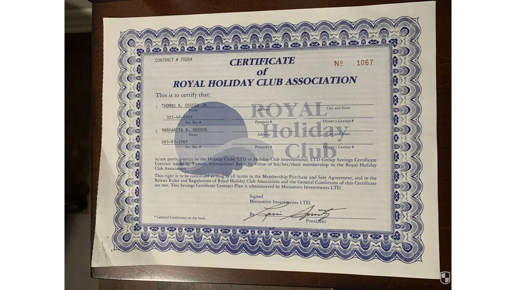 After 30 years and 9 months, we spoke with numerous people at Royal Holiday, both in person and by phone. We were instructed in April 2021, by Ms. Karina Islas, at Royal Holiday's Mexico City Headquarters, to send a copy of the certificate to Yamasu Bank and a letter requesting our annuity funds. Attached are copies of the two annuity contracts and the letter sent to two different Yamasu addresses (listed on the back of the annuity contract). One was sent to the Yamasu International Bank in the Cayman Islands, B.W.I., and the other sent to the office on the Isle of Man, British Isles. Both of these letters were returned to them as undeliverable. He never sent a request for the annuity funds to Life USA, due to the recommendation of Ms Islas.
