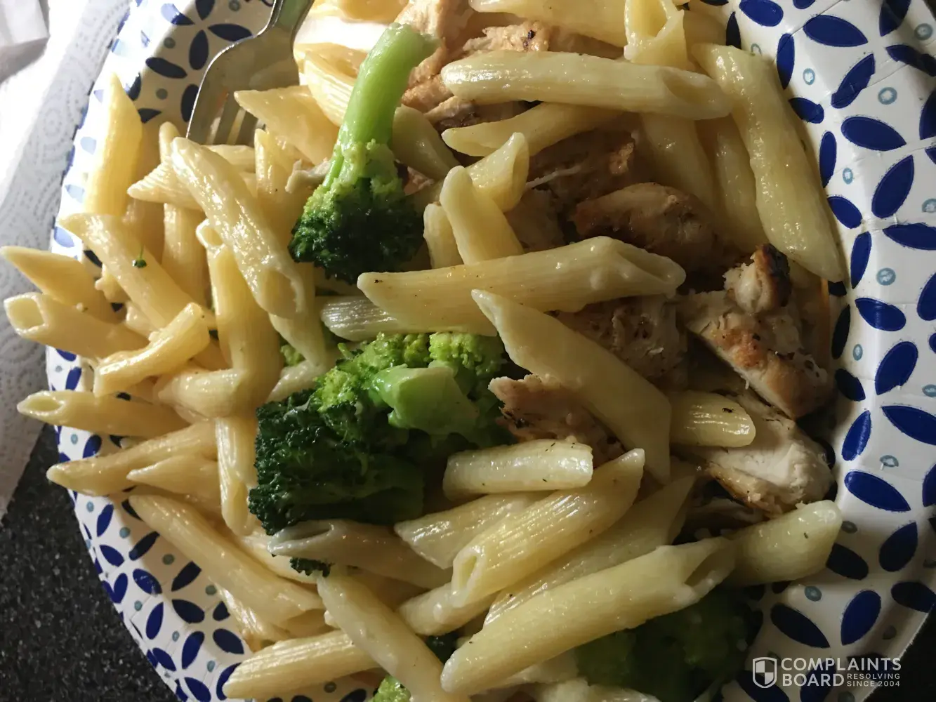 I'm complaining about the food l got on my takeout order. I ordered the chicken broccoli pasta. When l got home the food was cool not cold or hot but cool. But the worst thing about the meal was that the pasta was so dry there was little or no sauce on it. I've ordered this meal before with no issues but today it just wasn't done right. Very disappointed...