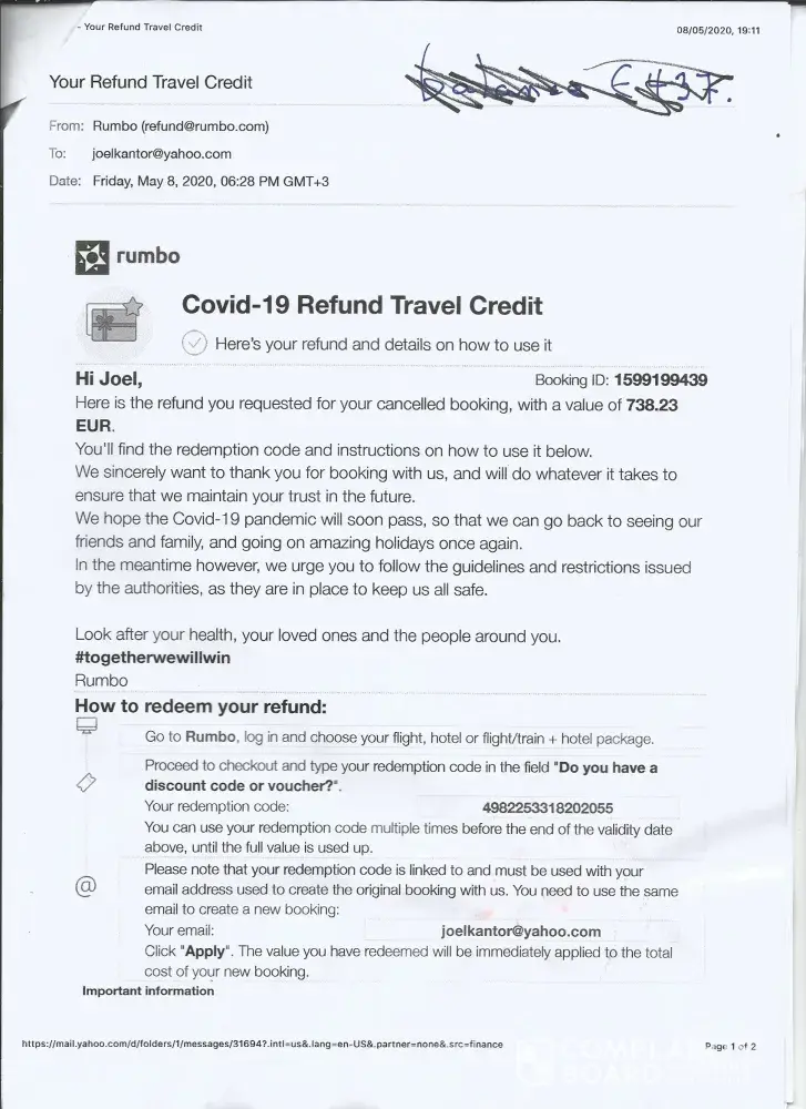 I booked a flight from Tel Aviv Israel to Toronto Canada through Rumbo.com. The flight was with Austrian air and Air Canada and it was cancelled due to Covid on 08/03/2020. I received a Refund and/or Travel Credit email from Rumbo on 08/05/2020 promising to refund 586.58 Euro or give me a travel credit for 738.23 Euro at my choice, They were to be effective between 08/11/2020 and08/05/2021.