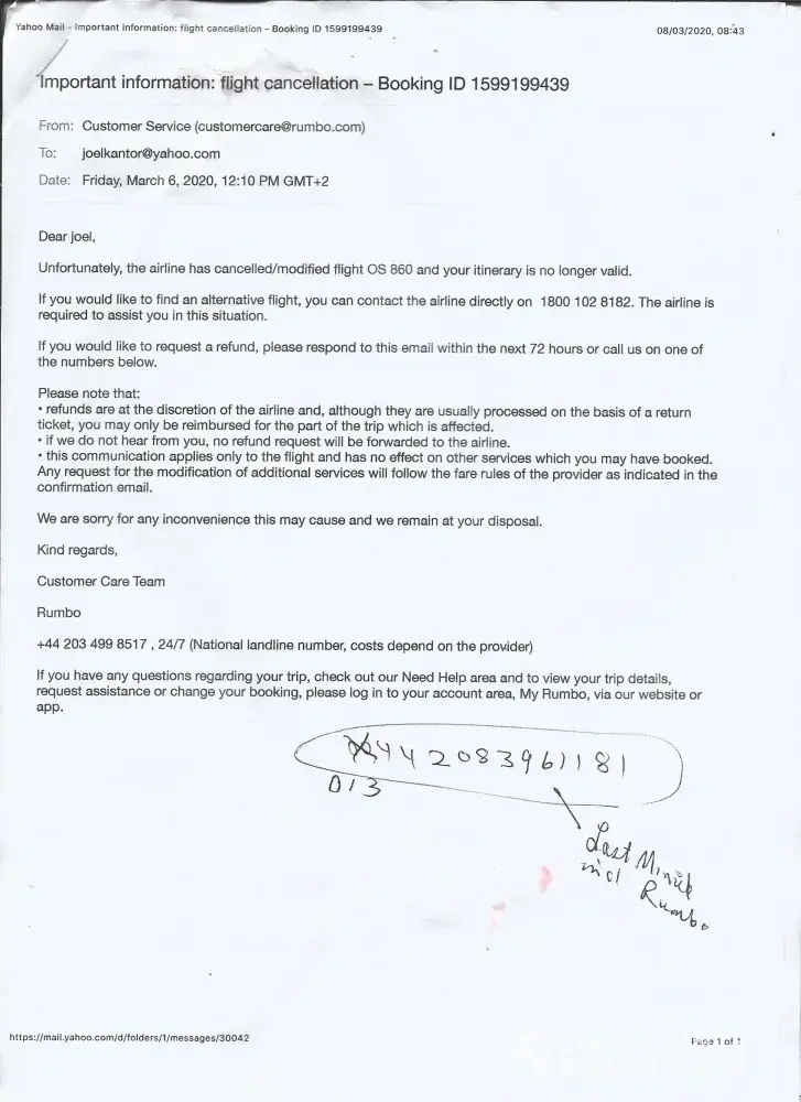 We can not reach Rumbo in any way and the personal accountpage on the website states the same information for weeks. The excuse is that they are gathering the resources, but they haven't had any costs of our flight since it was canceled by the airline. We have lost almost 2500 euro.