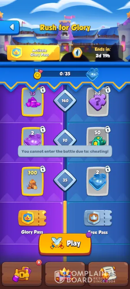 Rush royale team : my issue is this when I'm try to enter the any battle like royale trials , dragon rift , rush for glory than I am not able to enter the event and this problem showing these } you cannot enter the game due to cheating this is mentioned as in the below picture please help soon as possible Thanks