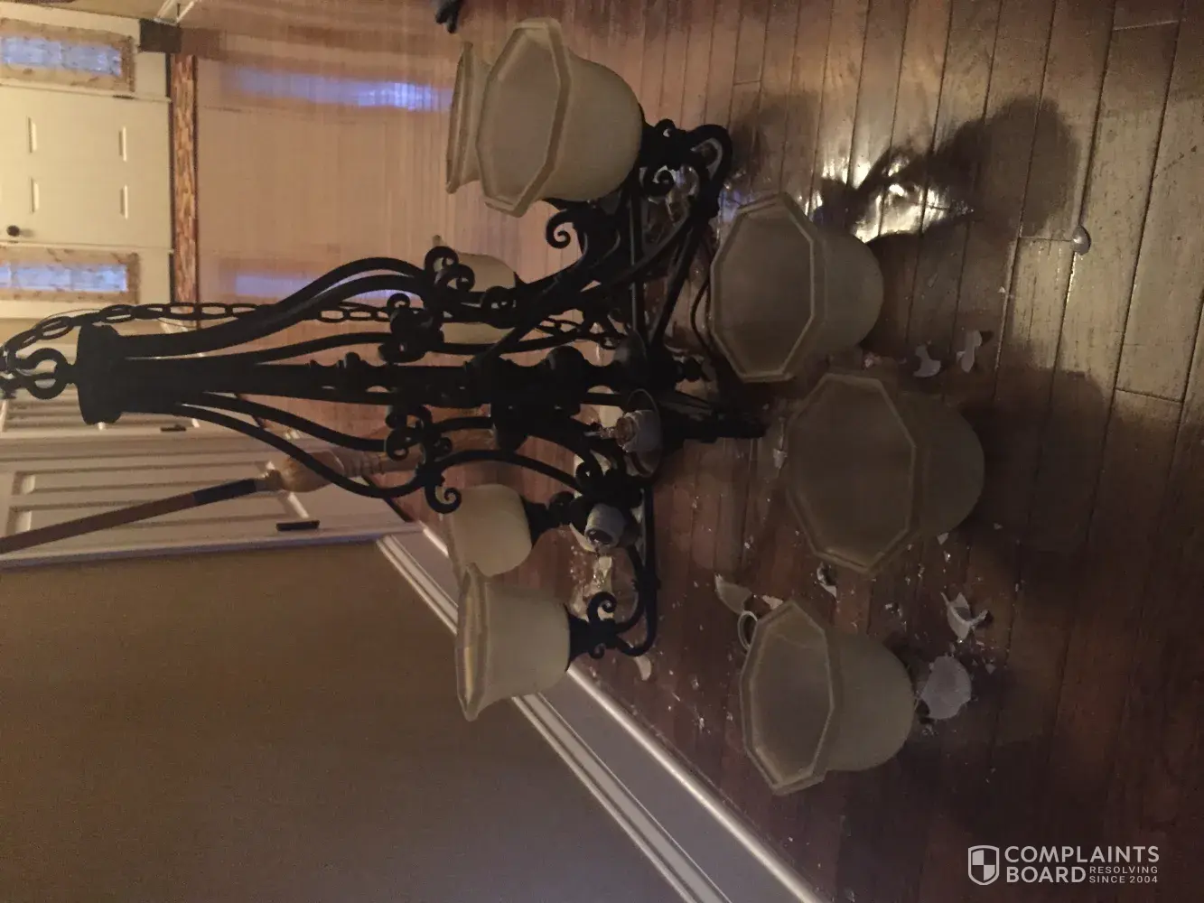 We own a Ryan home which was built in 2009. On Monday, 7/17/17, I arrived home with my sons from a vacation around 1200 pm to find that one of our chandeliers had fallen two stories onto our hardwood floor. I had a contractor come to let me know what happened and he noticed that the chandelier was held up by two very small inadequate screws that maybe measure 1". This chandelier should have been held up by much longer screws. I contacted Ryan homes on 7/19/17 around 1100 am and spoke with a lady who wasn't concerned at all. We have two other huge chandeliers which we are very concerned about that might also fall. The first time, we were very fortunate that no one was home, except the dogs and they didn't get hit. Who knows what might happen if another one falls. The lady I spoke with told me that they couldn't do anything about it since the warranty expired after one year. She also said that who's to say that the previous owner (who happens to be a lady in her 60s) didn't mess with that chandelier causing it to fall. I feel that it was negligence of your company to use the wrong screws and putting my family in harms way. I want this to be a formal complaint so that when this happens again (and it will d/t your short cuts) there is documentation of your knowledge to this issue and your lack of interest/concern and desire to make it right. I will be posting something in our neighborhood site to ensure everyone knows of your shoddy work so that if it happens to them, they know you were made aware of this issue and did nothing to correct it.