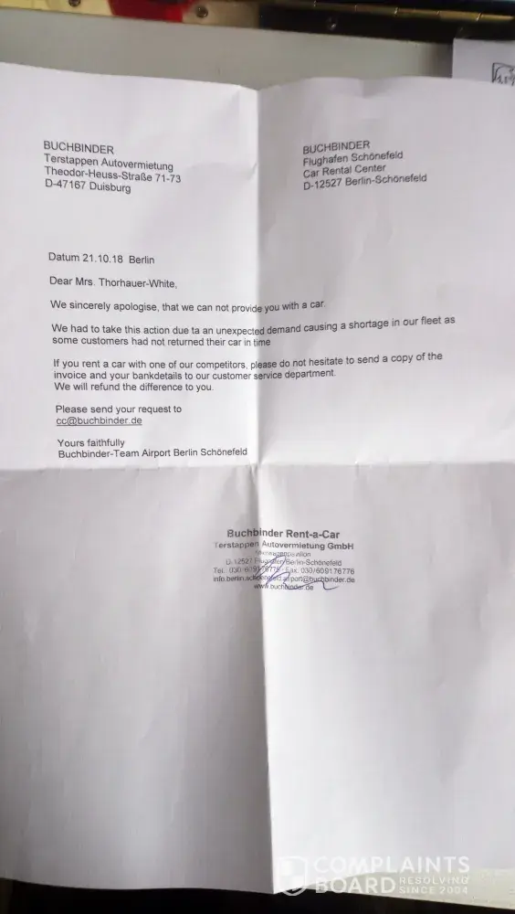 I contacted Buchbinder directly since my booking through Ryanair car hire went to them. Please see the below email trail in respect of an unfulfilled car hire and a request for a refund for the car hire.