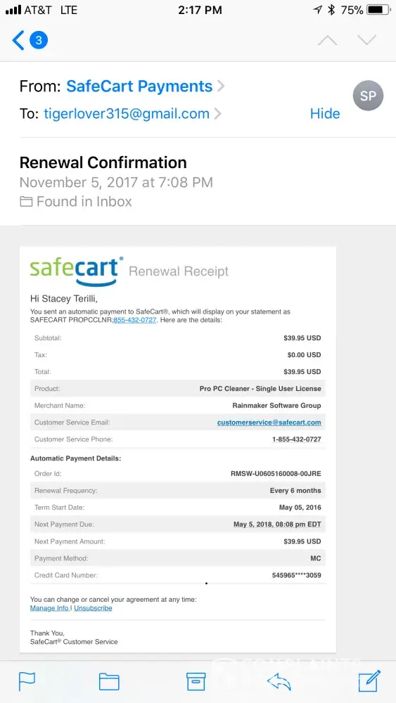I purchased the service for the PC cleaner on 5-5-16 for 39.95 and it renews automatically every 6 months. I looked online on the website to see what service it had me under and they have no knowledge. I have been charged this price three times and their service is crap. I have contacted them by email twice with no response. This is a scam. I will be trying a way to stop payment. I have already contacted the BBB as well.