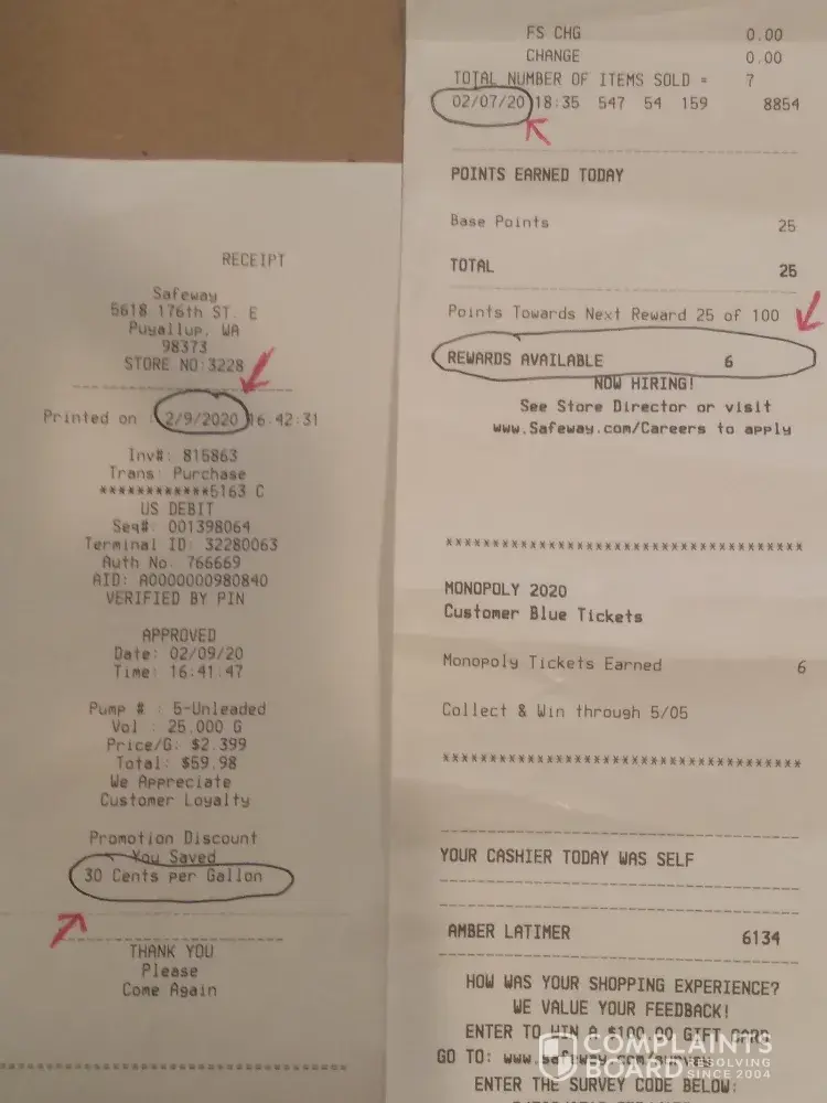 I usually shop at 10105 224th St. E. Graham, WA 98338. But I got gas yesterday at the 176th Safeway. I was supposed to receive 6 gas rewards off. I only got 3! And it says I have no gas rewards left! I was just at the store on the 7th and it said I have 6. I have the receipts to prove it. I don't understand why i keep having issues with your store. I am...
