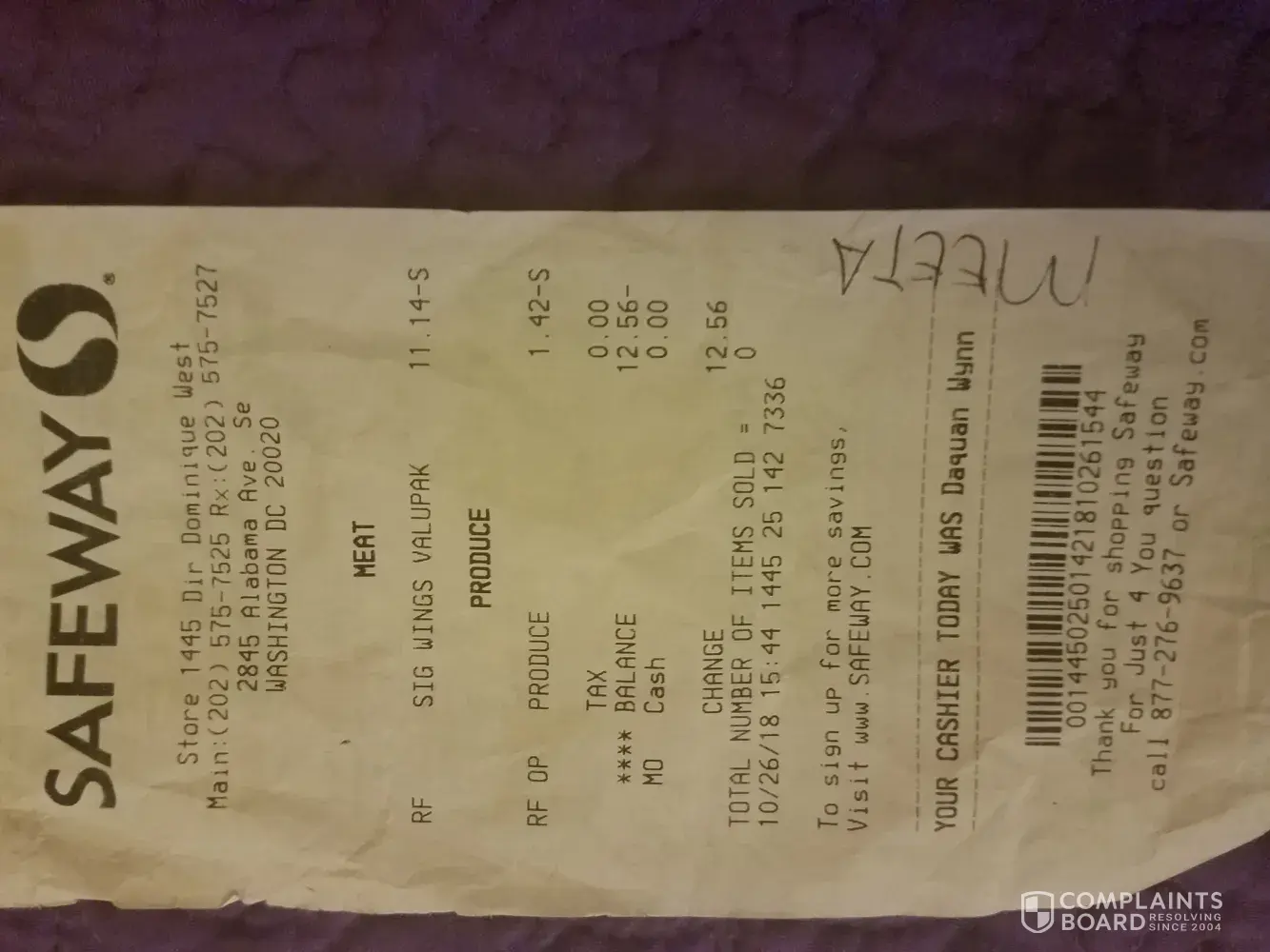 I was at the customer service desk to return 1 tray of chicken wings and a bunch of bananas that I purchased from that store (#1445) a few hours earlier. I found a cheaper price for the items elsewhere and purchased them there.