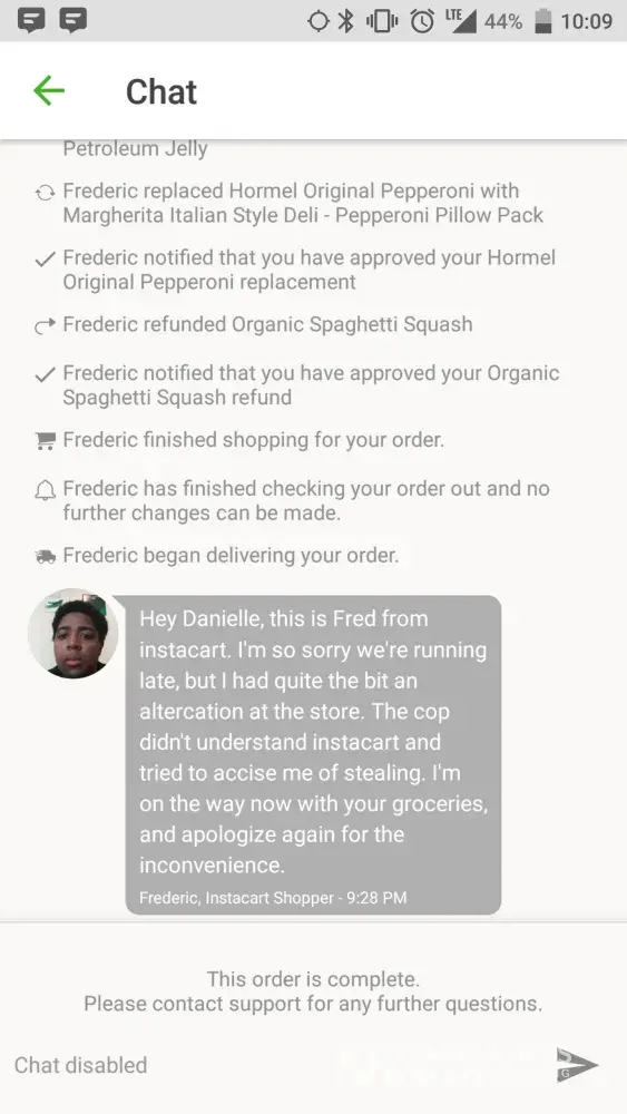 Today I shopped for my groceries through the app/service Instacart because it was down pouring in D.C. and I don't have a car. While picking up my products, my shopper's phone died and he had to go up front to charge it so he could finish fulfilling my order. While there, he was accused of trying to steal the groceries. Despite having his Instacart credentials on him, management got the police involved and put all the groceries back, forcing him to redo the entire shopping experience. For the sake of extreme clarity, Fred is black. This poor guy was out in the rain doing his job with proof on hand while I watched him shop on the app, yet Safeway made disgustingly bigoted assumptions that wasted two hours of his time and humiliated him in the process. My heart breaks for him and I'm reviled by that store's management. They own him at least ten apologies and I doubt he'll get one.