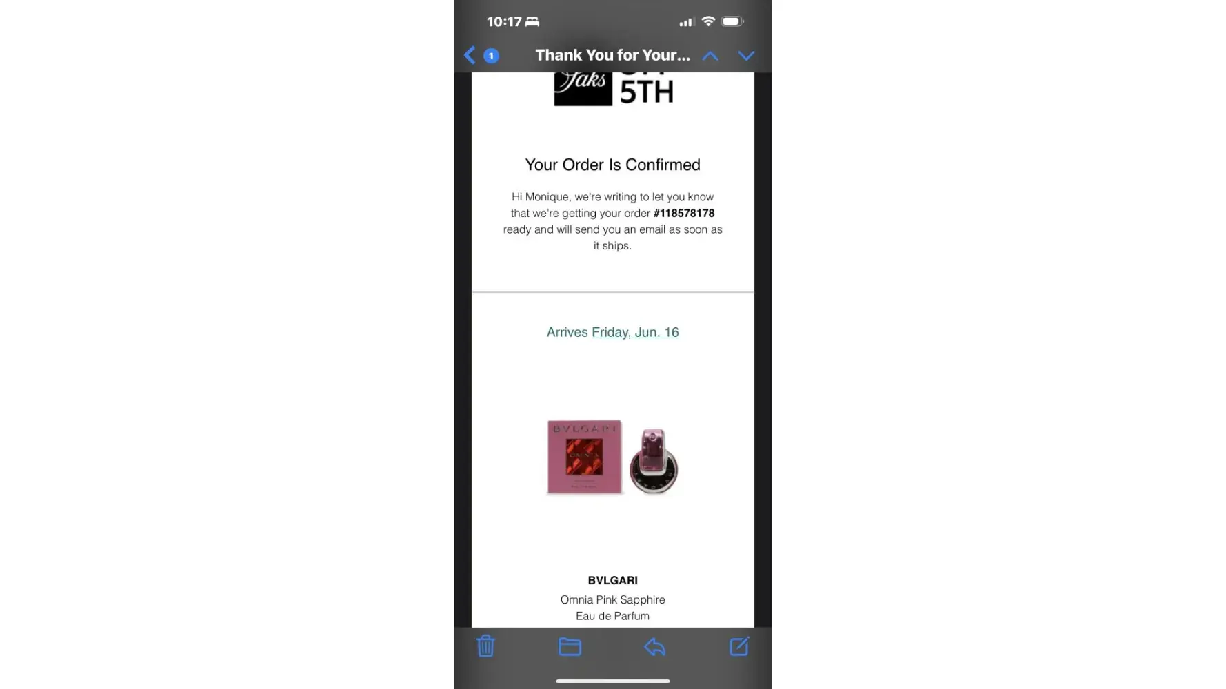 On 6/11/23 I ordered from the Saks Off 5th website a 1.35oz. bottle of Bulgari Omnia Pink Sapphire Eau de Parfum (see screen grab from order confirmation).