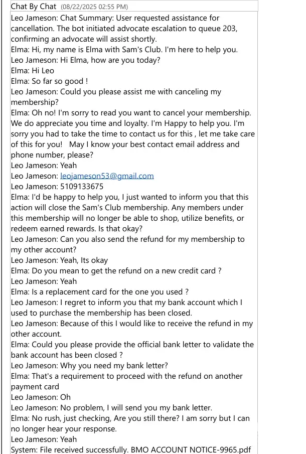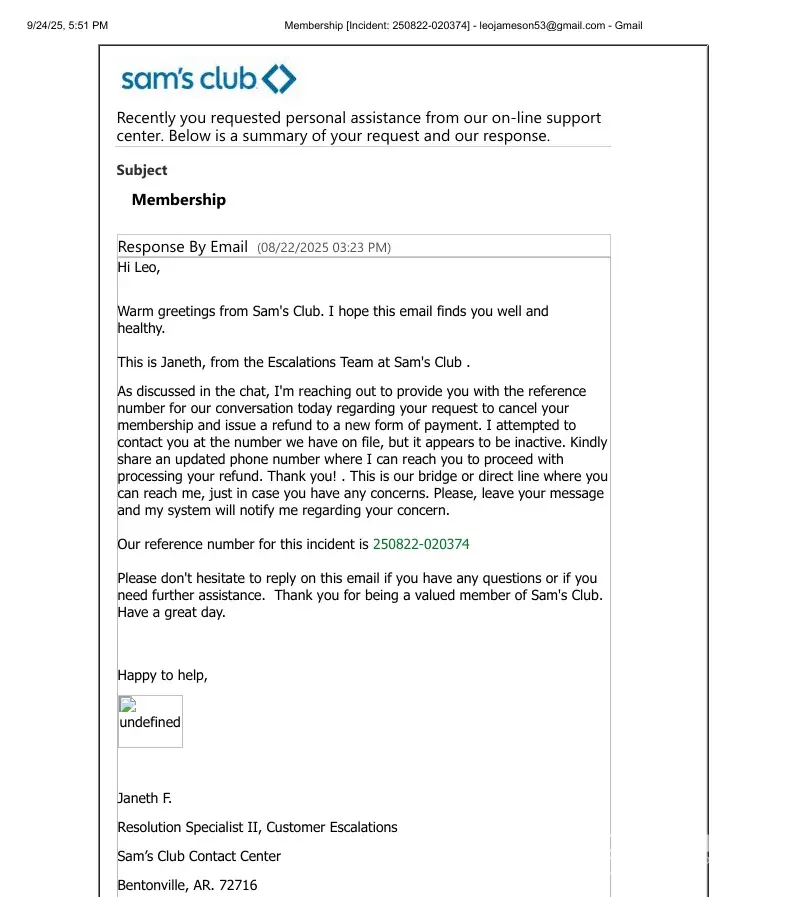On August 23, 2025, my Sam’s Club membership was canceled. At that time, I was told that a refund of $110.00 would be issued. But, I didn't received. Since then, I have made multiple follow-ups with Sam’s Club representatives, including advocates and resolution specialists. Each time, I have been told that the refund “was processed†and that I...