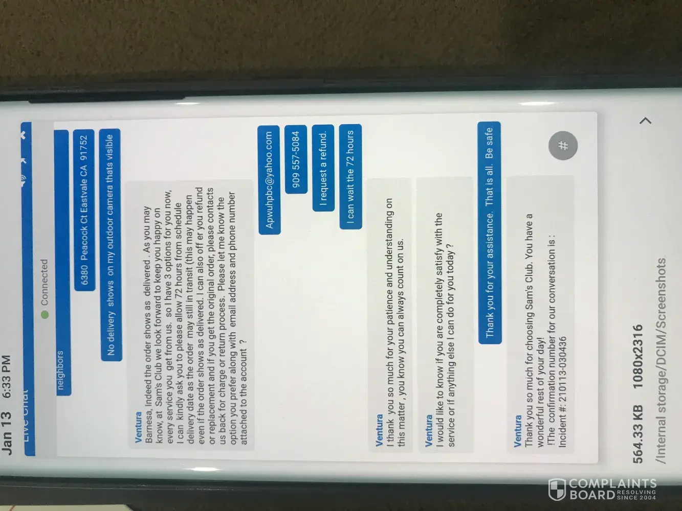 My online order [protected] was delivered to the wrong address. I contacted Sams Club through online chat incident #[protected]. The rep Ventura asked that I wait an additional 72 hours before they would refund me. That time was up on 1/17/2021. I contacted them again on 1/18/2021 to request my refund and was told I must wait additional time. This is unfair! Now I want the order and my refund.