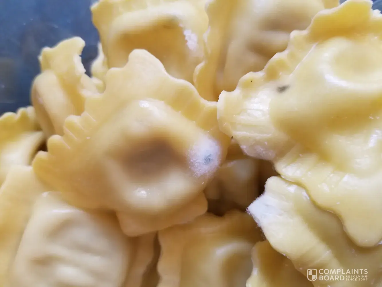 When I removed it from the fridge and opened it I saw some mold was covering ravioli.