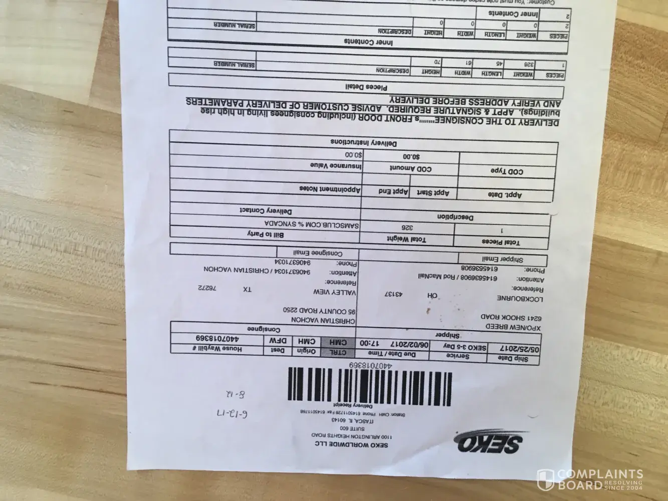 I order 4 things online on may 26th, 2017 (order [protected]). I received on June 12th one gear drawer from my order. On Sam's Club packing slip ([protected]) it said 2 and on seko (delivery waybill [protected]) it said one. So I received and sign for 1. It was damage so I call back and they give me a RA number [protected] and Seiko came pick it up on June 30th on waybill 4407018369R and they send me another gear drawer to replace the broken one. On July 12th I call back because I was still missing one item from my original order, the lady call Seko and found that Sams Club had ship 2 but Seko only delivered one. She was supposed to call me back to find the missing one and she never did. I call three different time after that over 2 month and after I tell my story, they put me on hold to check and at some point They hang up each time.
