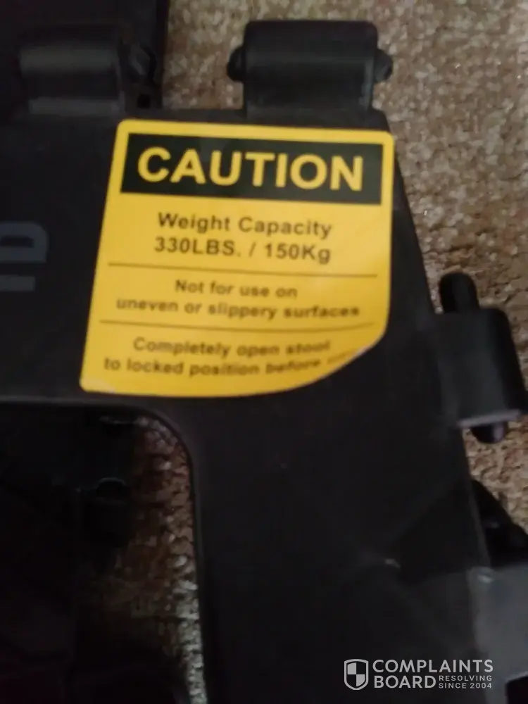 This Samsonite step stool that claims to handle 330 pounds nearly killed me as it collapsed under me. I weigh 180lbs... This is dangerous. I can't believe it just crumble into pieces. The pictures show clearly the damage and the claim of 330lbs. would like some resolution before contacting an attorney.