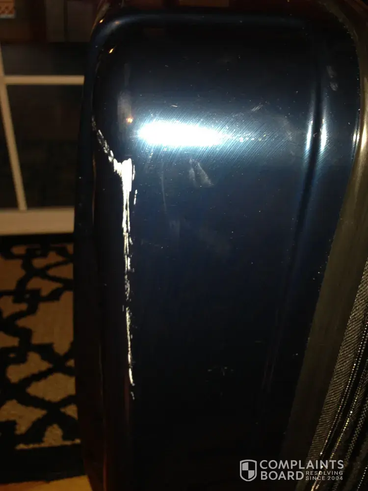 See the attached photograph, this recently happened on a flight from Singapore to Busan, one of the four wheels has been forced into the case. No matter what this cannot simply be a question of poor handlng / mis-handling, besides does this company not claim its products are indestructible ?