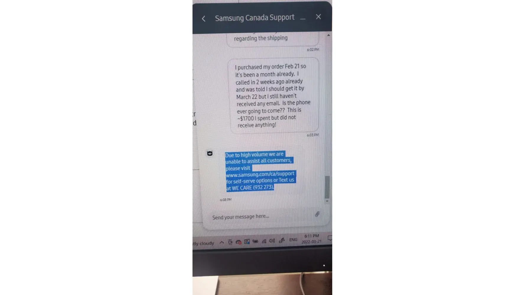 I purchased a burgundy 512BG S22+ ultra on Feb 21, 2022. My order number is CA220221-[protected]. The order said shipping date starts March 8, now it March 21 but I still never received any email. 2 weeks ago I called Samsung and was told they I will receive the product by March 22 but of course I didn't. It's so hard to get a hold of anyone. This is almost $1700 I paid for a month but didn't receive any product! I even bought Samsung care but since I didn't receive the product, when does my samsung care actually start? It will be a month or more wasted. I have been with Samsung for years and have been a loyal customer until now. I tried the online chat and this is what I got in return "Due to high volume we are unable to assist all customers, please visit www.samsung.com/ca/support for self-serve options or Text us at WE CARE (932 273)."...This is not even called "service" it's just absolutely not acceptable!