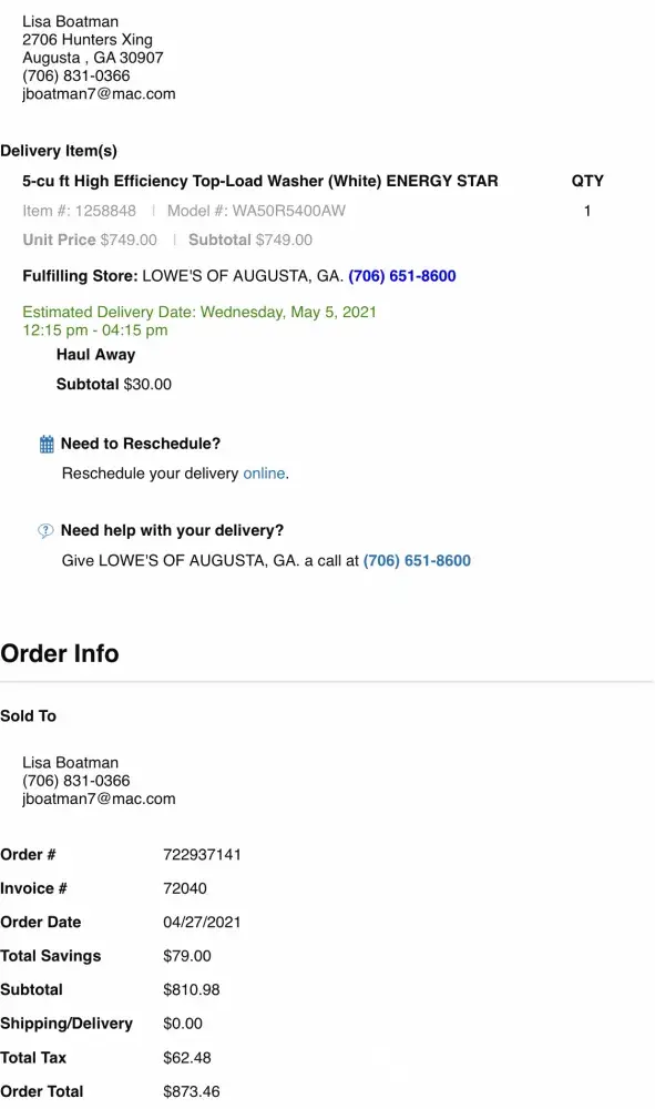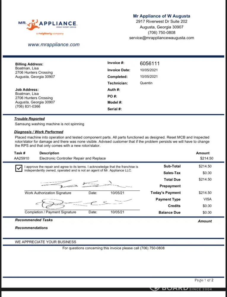 I purchased a Samsung Washer on 5/5/21. By 10/1/21, it no longer would spin. I tried calling Lowe's where I bought it who referred me to Samsung repairs. I call them and after playing service technician with guy on the phone attempting to repair it, we exhausted all possible resources and he agrees I need a technician. But can I make an appointment? NO! I have to wait several additional days for a company named Cyber World to even call me to finally actually make the appointment. I don't have time for this! I NEED this machine! I paid almost $900 and it didn't even make it 5 months. I had a local guy repair it (cost me $214.50) he tells me if this doesn't repair it he would need to replace whole motor as well as that is the only way to fix it. I was in the middle of second load to wash after repair and guess what? NO SPINNING AGAIN! I had to removed about 40 lbs if soaking wet towels and transport them outside (from my second story) to wring them out enough to put in dryer. I attempted again to have the machine repaired but I was again given a far off appointment date which is unacceptable! This machine was UNDER WARRANTY! I have just ordered another brand of washer to be delivered this week! You all ripped me off! I am furious and should be reimbursed for this machine! I am 60 years old and not in great health and don't have time or energy to keep being jacked around on a good faith purchase! You received ALL my money immediately but I cannot count on you! I want reimbursed.