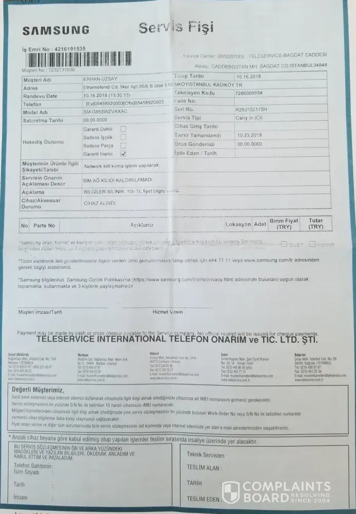I have purchased a Samsung S8 plus cellphone from Best Buy store in Toronto Canada and returned to Turkey where I live. I contacted the Samsung service Center here in Istanbul (Center Number: [protected]) in order to have the network sim lock removed on October 16, 2018. The service center said one week later on October 23, 2018 that they were unable to do so and returned the phone still locked. They also lost all the original documentation I have submitted with the phone including receipts, passwords and warranty information.