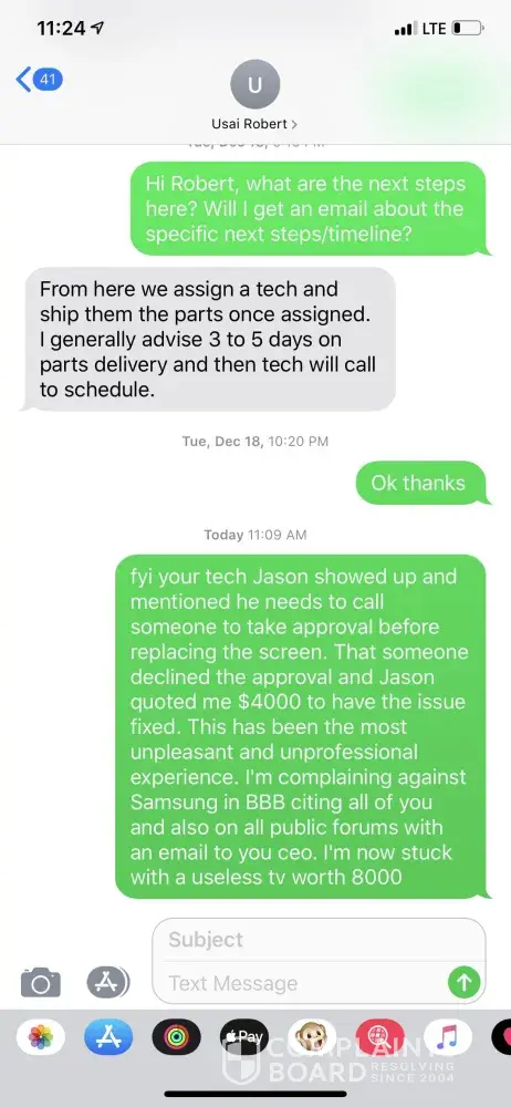 After 3 weeks the tech, Jason (cell [protected]) shows up at the house with a replacement panel. He mentions that again needs an approval to get the issue fixed, inspite of me telling him that robert has already approved it over txt messages. Whoever the tech called, decline to approve the replacement and gave me a quote of $4000 to fix the screen and even if i want to pay for it right now, it will take another week for them to create a ticket in their system, get another tech scheduled to come over at my house at later date. Avoid samsung at all cost! I'm stuck with $8k tv