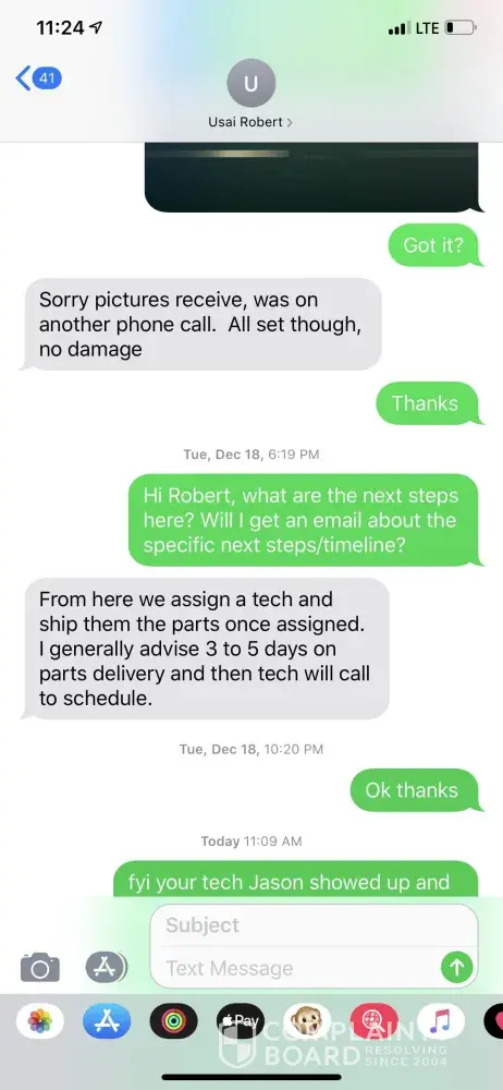 Robert's txt - "Sorry, pictures received, was on another phone call. All set though, no damage. From here we assign a tech and ship them the parts once assigned. I generally advise 3 to 5 days on parts delivery and then tech will call to schedule"