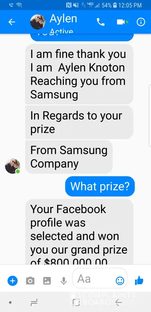 Please see photos below. I was contacted by the person on messenger, stating that I was selected for the prize of 800.000.00, and a samsung notebook, after accepting a friend request. I questioned the person on why wasnt I contacted before friending them, and they said they tried contacting me before I friended them. Here is the info in the pictures attached.