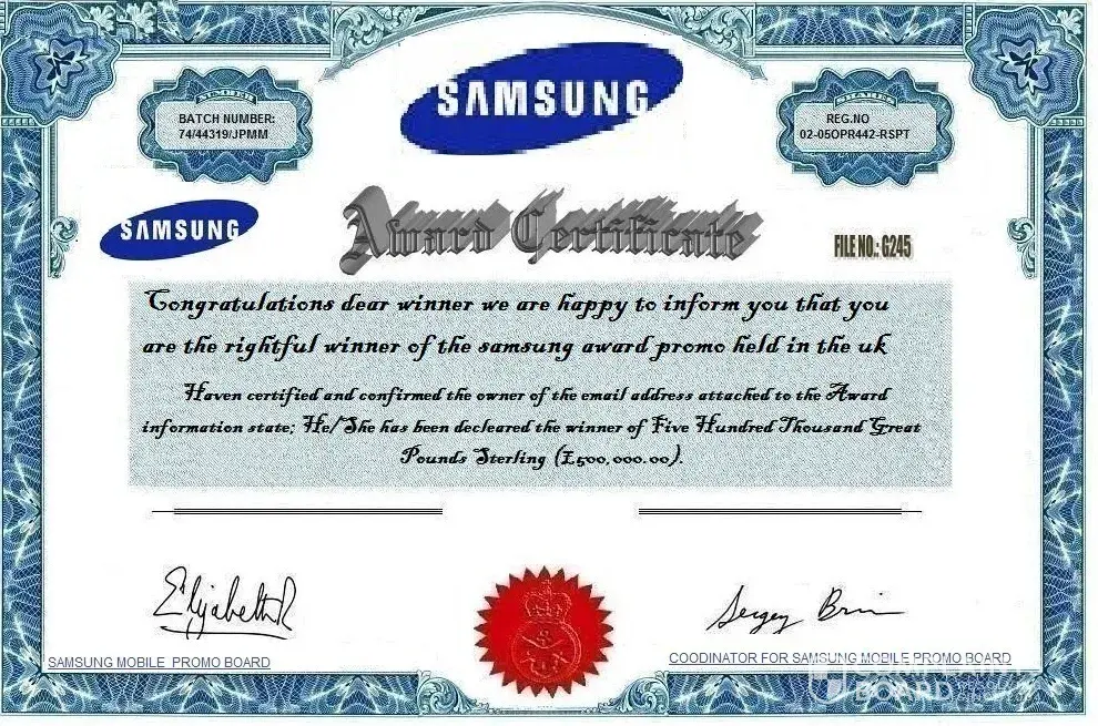 Respected sir/madam, I have received below email for samsung, I want to know is it genuine or fraud thanks & regards, satish [protected]@gmail.com [protected]@rediffmail.com samsung winning application form inbox x samsung company samsung company 11:05 am (3 hours ago) to me samsung financial empowerment fortune program ®2015 samsung electronics (uk) ltd samsung house 1000 hillswood drive chertsey surrey kt 160 ps, united kingdom mr. george morrison payment number: nk249naa verification number: nm-00222-674pf country: india date: 12th of november 2015 approval of award winning prize of 500, 000.00 gbp for delivery/transfer. - attention to the owner of this email address-, we are in receipt of your e-mail and wish to thank you for your co-operation, I wish to inform you that my duties include representing your interest and guiding you through claiming your winning cash prize. we want to clarify you here that after a good scrutiny of your provided mail, we are glad to inform you that you are one of the winners of the uk samsung company empowerment program sponsored by the samsung company inc the uk samsung company empowerment program has been on for more than a decade now and we have changed the lives of many since then. your life is about to be changed as you are one of the lucky winners of our annual samsung financial empowerment program sponsored yearly bonus promotional, your winning cash prize of 500, 000.00 gbp (five hundred thousand great british pounds) , will be paid to you soon as you meet with the requirements. I wish to inform you that all authorities involved have certified payment of your mobile draws claims amount to 500, 000.00 gbp (five hundred thousand great british pounds) , which is prize money from samsung financial empowerment program mobile draws, which was drawn through a computer random system of all the mobile users worldwide. be informed that instruments of payment for the sum of 500, 000.00 gbp (five hundred thousand great british pounds) to you is already in our possession and shall be processed upon meeting the requirements stated below. you can now begin the final step of the claims process, which is the transferring of your cash prize to you. with regards to this, there are two options open to you, you are required to select the more convenient of the two. you are advised to complete the below form and send with the fund release application letter to me to start the process of release your winning fund to you. the options, together with their associated conditions are presented below: {option 1:} your prize money will be wired to your bank account via an automated direct wire transfer system operated by nominated payment center. hence you would be required to send us your bank information, i. e.. full name... address... age... sex... nationality... mobile number... state of origin.. marital status... occupation... bank name... bank account number... bank branch, swift/iban codes id proof... {option 2:} courier of your winning cash to you via dhl courier company, which is our assigned courier company. please note that your cash will be delivery to you in your nominated address, the courier company would bring the cash to your postal/home address nominated by you and as written below (please you are allowed to correct or amend your contact information in your next mail) you will be required to send your international passport, driver’s license or id card to me via email attachment as it will be used for a proper identification of you during delivery of your winning cash to you by the dhl courier company through our delivery agent. full name... address... age... sex... nationality... mobile number... state of origin.. marital status... occupation... id proof I expect an email or call from you immediately fill the application form letter and making a selection from the two options above. congratulations and have a wonderful week. I wish you on behalf of all members and staff of uk samsung electronices co. ltd congratulate you as you expect your wining prize and I hope you spend your money wisely and to the betterment of your community and wish you the best of luck as you spend your good fortune thank you for being part of our commemorative 40th years anniversary draws. past winners around the world full of excitement best regards, yours faithfully, click here to reply or forward 0.13 gb (0%) of 15 gb used manage terms - privacy