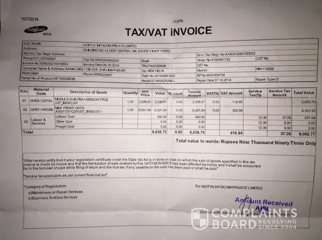 I lodged a complaint to customer care of samsung service centre on 21.092014 and accordingly complained was registered. On 23.092014 I enquired again with the service centre, I was told that technician will contact within an hour. But no call received. Again I contacted customer care and wanted to know the status of my complaint, I was told that because of long distance from the establishment of engineers it will not be able come on 23rd.
