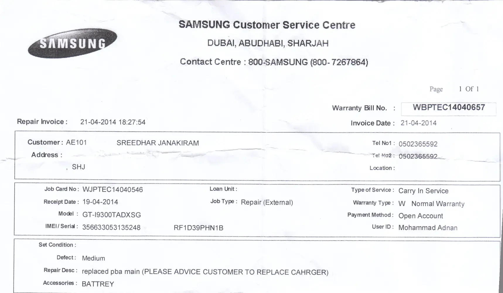I gave it to samsung customer service centre in sharjah on 26th january 2014. They said the pba main assembly has been changed and its working. Again the same problem started and given for service on 21st april 2014 and got back with pba main assembly changed. Now after 6 days I am again facing the same problem.In addition to this the charger takes about8 hours to charge fully. The service centre says the charger has to be changed at my expense as the charger warranty is only for 6 months how many times should I run around the service centres? Having bought an expensive cell phone, this is the price I have to pay!. I request the complaints board to take some action in this regard. I should get the value for the money I have spent. The receipts of customer service centre is attached herewith,
