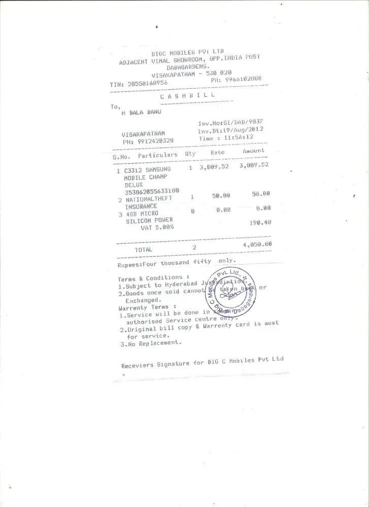 I lost my Samsung Duo Model No.C-3312 with IMEI No.[protected] on 24-11-2012 was missing while travelling in a city bus in between Kancharapalem to Urvasi Junction. I lodged a complaint in 5 th town police station. They issued a certificate stating that they made necessary enquiries about the above missing cell phone in and around limits of Kancharapalem Police Station by deputing their men on station routine enquiries but in vain. I am sending herewith copy of purchase bill and certificate which was issued by 5th town police station for necessary action.