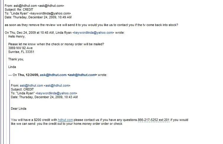 "FACTS of my experience! ***FACT: When I ordered a TV it was listed as in stock and would go out in 24 hours. ***FACT: 2+ months went by and no tv. ***FACT: They told me they can not change their website. I don't understand a company that doesn't have control of what is on their website. ***FACT: **********THEY LIE TO CUSTOMERS**********. I ordered a TV that they said was in stock and it was on back order for 2 plus months. I had numerous phone conversations where they promised me things they never delivered. **FACTS: They promised (I have email proof) that if I remove my horrible review of them they would give me 200 to pay for a tv with another company. They responded (I have email proof) that the check was in the mail. They told me I would get HDMI cables mailed to me when I canceled my order with them. ***FACT: I waited 2 months before I canceled my order with them. I waited 3 weeks after they promised me a check. I canceled my order and never received HDMI cables ***FACT: This company lied to me via email and phone on numerous occasion with no qualms. ***FACT: I reported them to BBB.org ...DO NOT DO BUSINESS WITH LIARS Please...