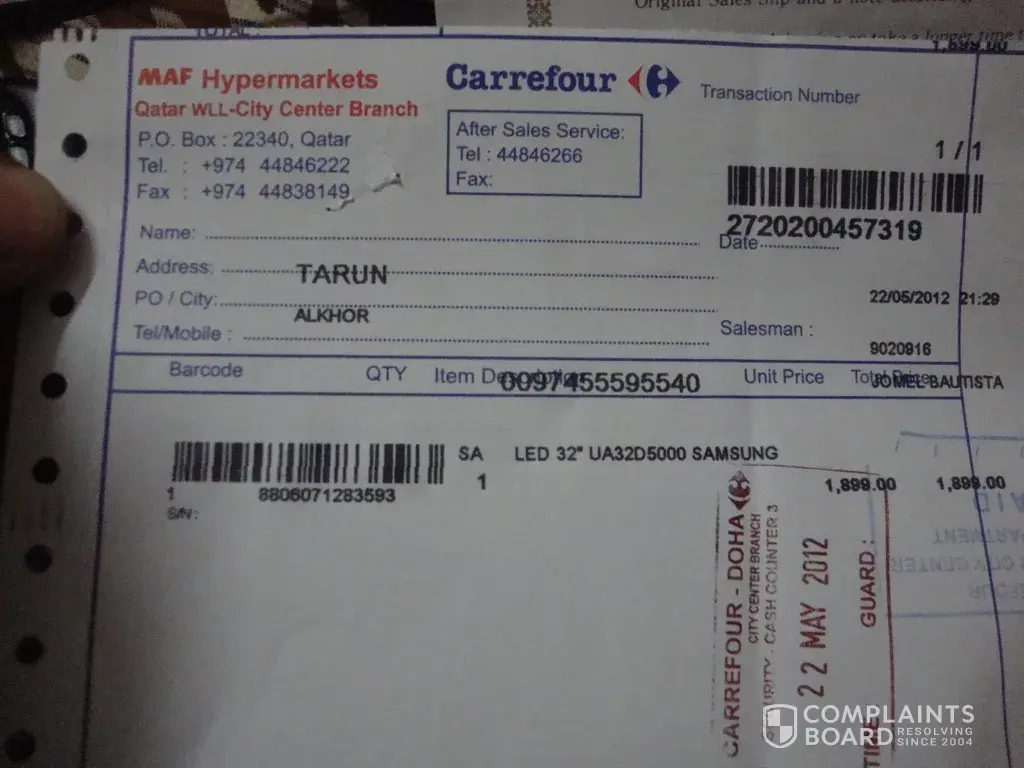 I bought a 32’’ Samsung LED TV from Carrefour on 22-05-2012. When I asked salesman for the TV he gave me some old front side damaged box. I requested him please give me another piece cause its look like damaged from screen side, cause there was big damaged from front side, But he asked its last piece and they don’t have stock but he assured me its all ok. Then he put some hard grey color tape on damaged area.