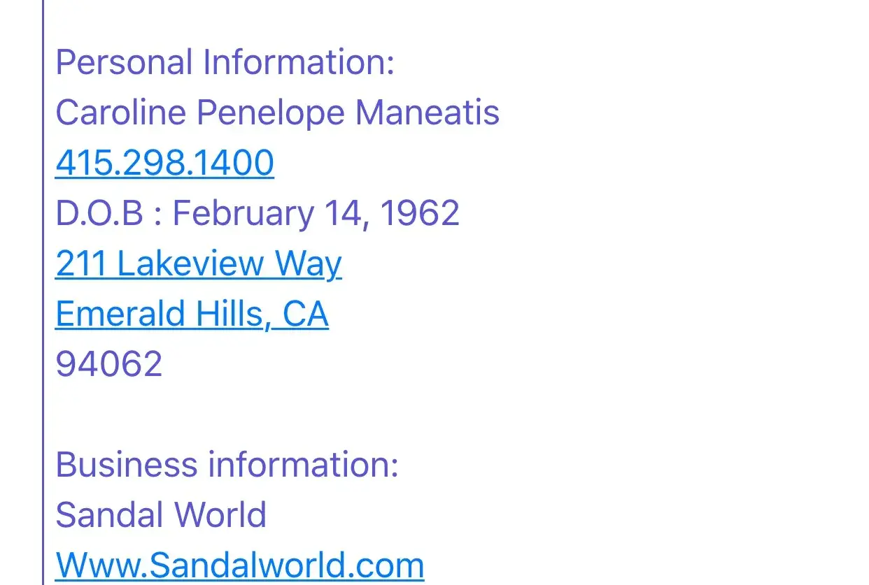 Her name is Caroline Penelope Maneatis, she has been sued several times in civil court and has a horrible criminal record and more coming . Caroline Penelope Maneatis is dangerous and unfit to be in society. How can she ship shoes when she is not privileged to have a license because of numerous drug/alcohol charges ? June 2016, she was sued AGAIN from a shoe company she owed funds too! That's just 1 of 8 that had to take action, plus her current "criminal cases" those to come