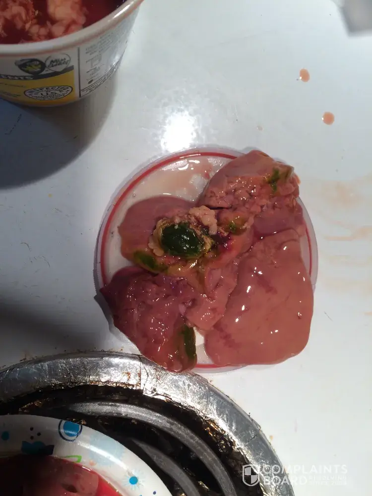 It has been over a month and after seeing all of your "we take care" commercials, I convinced myself that it must have been a rare thing, so today I bought them again and these are as bad as the others This time I want to let you know and I do have pictures. The pictures don't do the livers justice, however. The dark places in the pictures are dark, slimy, green. These will be going back to the store in the morning.
