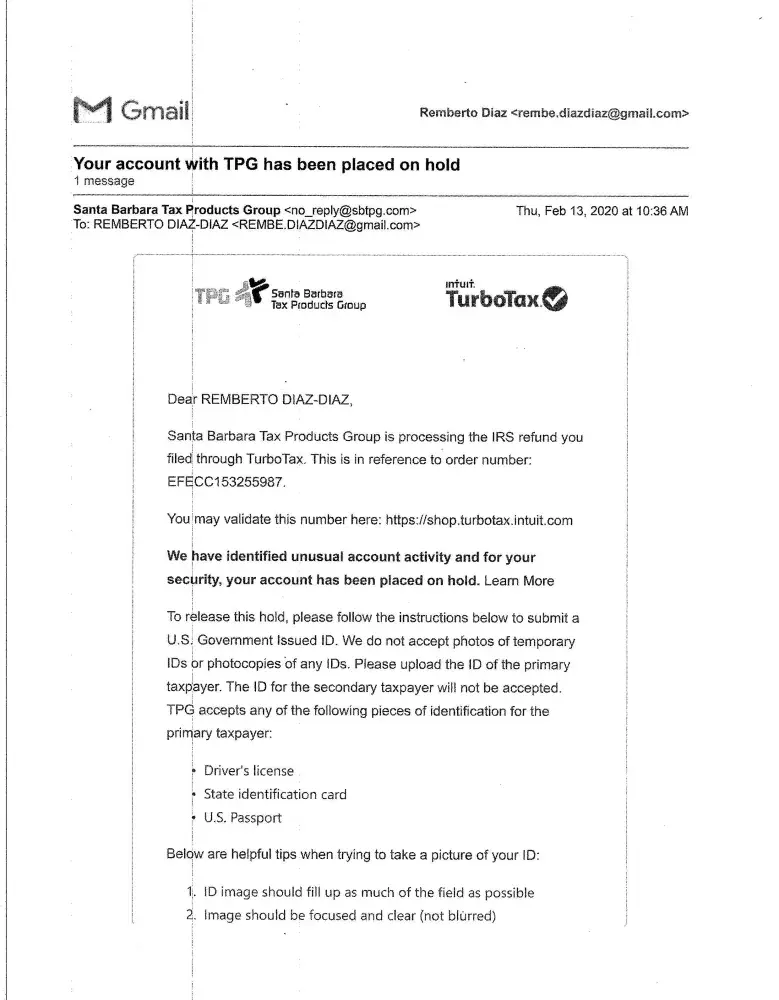 I filed my tax return through this company mid February 2020. After submitting my return electronically I was asked to provide my government I.D. which I did and thereafter my filing was accepted. The IRS send my return on February 20th to Green Dot which is an entity afiliated with Santa Barbara Tax Group, afiliated with Turbo Tax. They intern were suppose to collect their processing fee and forward my refund to my bank account via direct deposit. When I checked with them, they put a hold on my account stating that there is suspecious activity and requested I email them copy of my government I.D. again. I did this a week from today 03/05/2020. I called and spoke to one of their reps and was told that it took a week to resolve this matter but I haven't heard back. I called today but they have an automated answering system that keeps you on hold for a length of time then disconnects the call. This is the first time that I filed my return online using this company and my last, nor would I recommend it to anyone. The service is horrible and their online system is the same, you simply don't know what is going on with your money.
