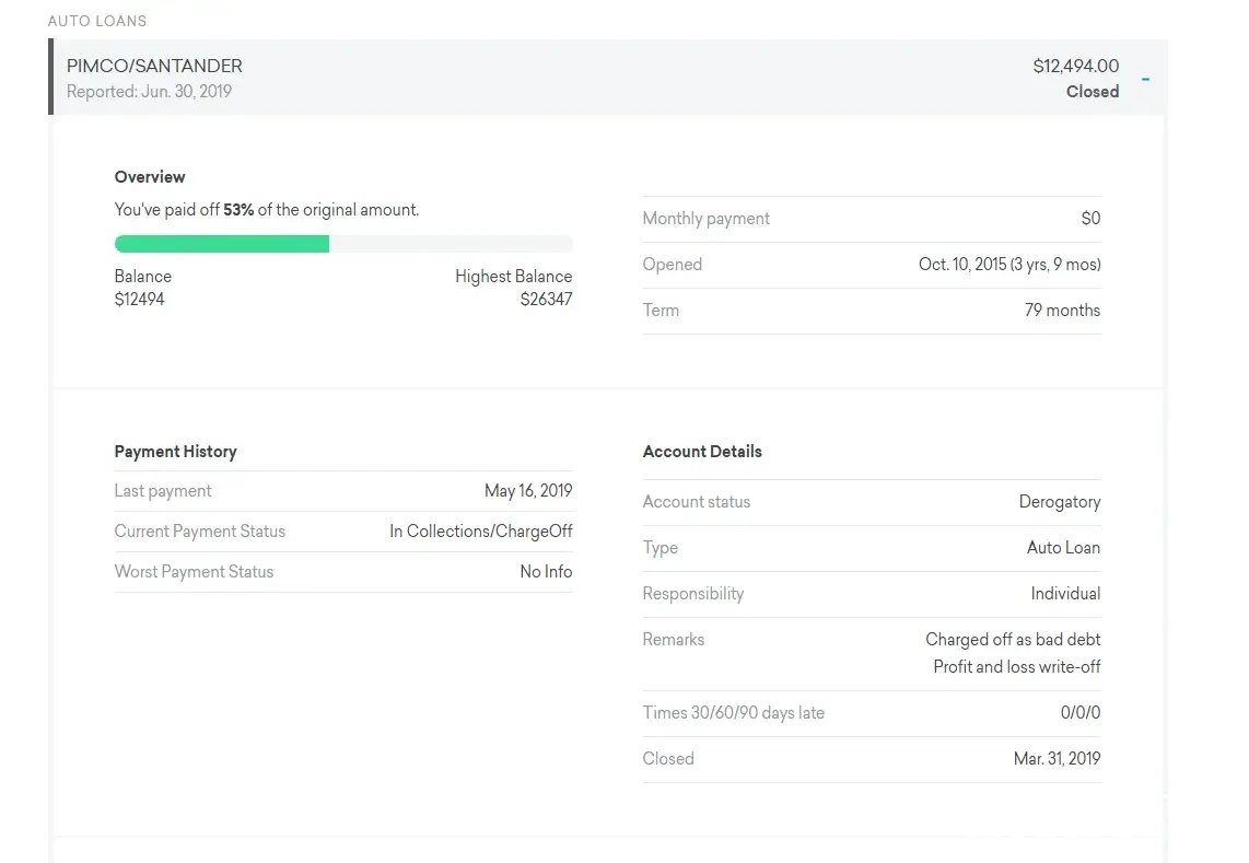 I bought a car from Cable Dahmer which was a lemon but I kept the car and drove it for 5 years. I had a accident in the car and was out of work for a bit until I found another car from a family member. I owed Santander under 1100 for the remainder balance of my car. My car was reported as a charge off before the 180 days mark. I talked to someone who told me if, I pay the remark would be removed. 6 years later the mark hasnt been removed and it has made car financing hell for me. People treat me like I didnt pay my car off. I paid over 10k for a car to had my report scared up for 6 years over a grand. Its unbelievable this happened to me. They recieved all of their money and I wanted to go with my life. I was denied when I tried to get another car by this company. 6 years later after I got my credit decent now these guys are sending me letters to buy a car from them. I think its a dirty game for companies to prey on people with bad credit and dont work with the people. Why repo peoples car to sell the debt off to some agency to harass a person with bad credit or no credit. This company had been making money off people faults.