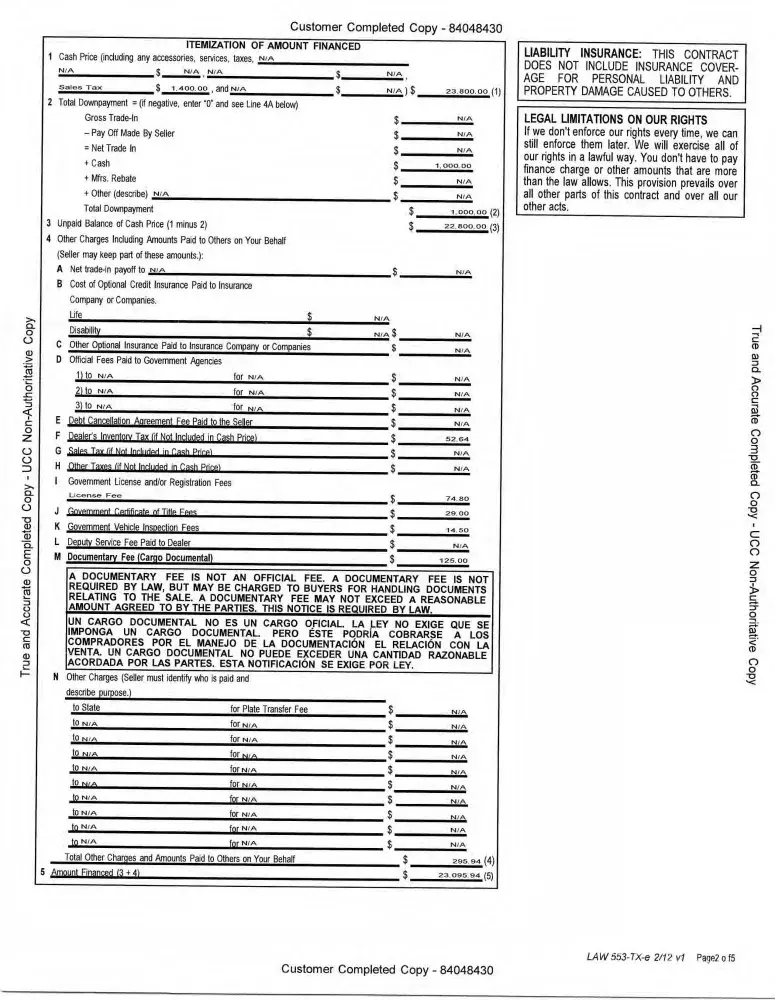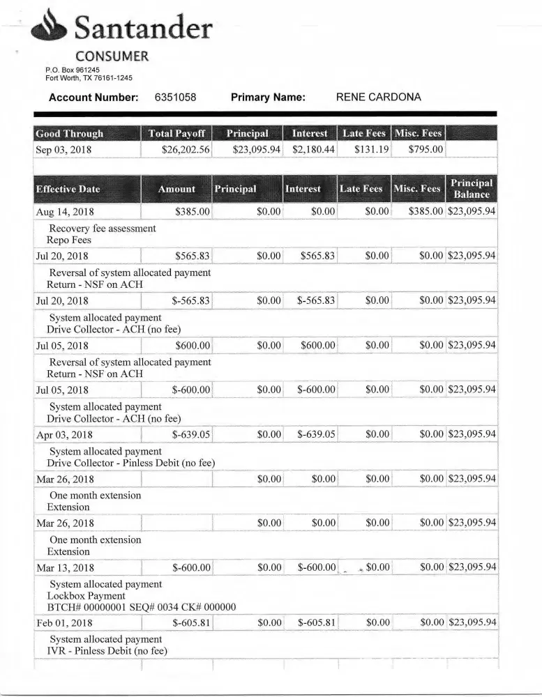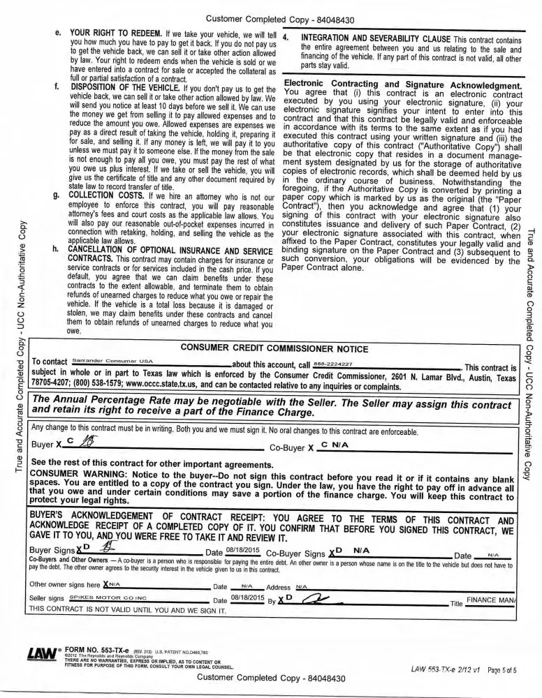 I respectfully, request that if you can look this for me. I am attaching the Spikes Sales contract with my correct signature, Santander payment detail history, and Santander Contract (forged signature). If you compare the signatures, they are not even similar.