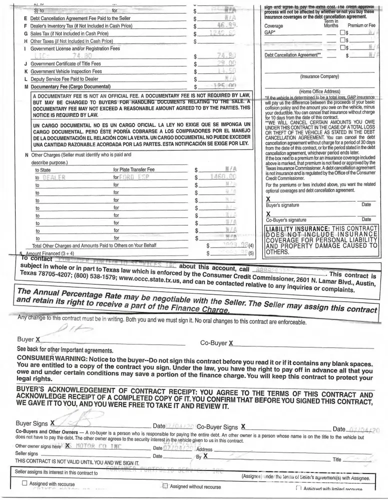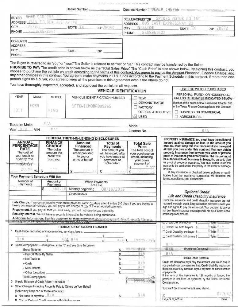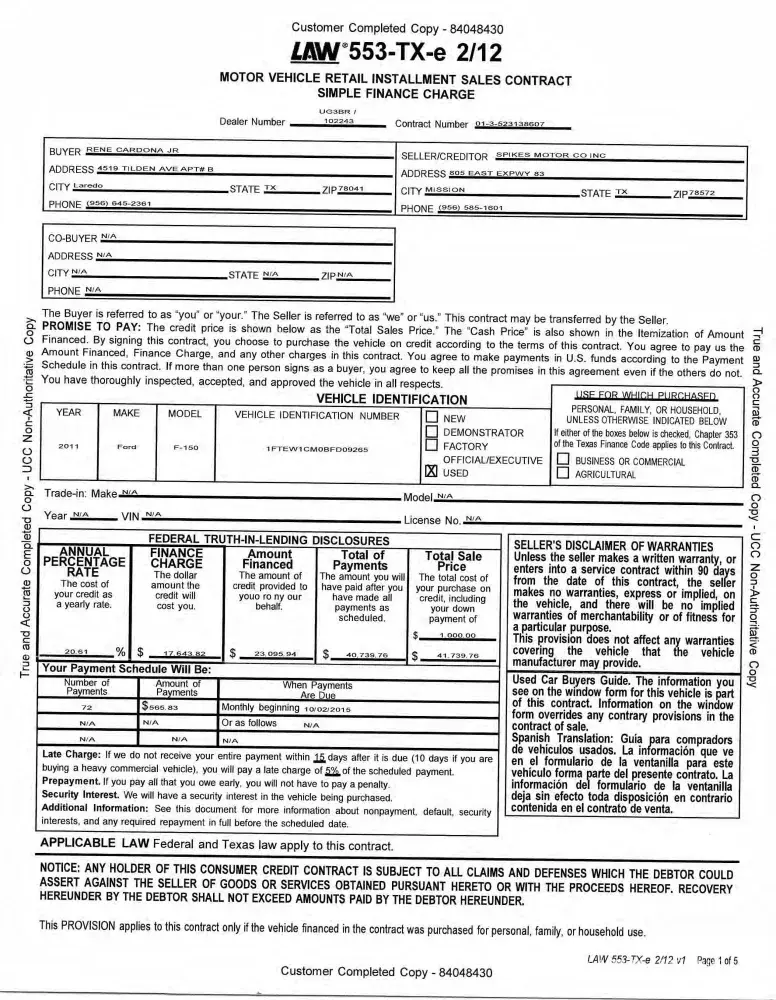 I purchased my truck from Spikes Motor Company in Mission, Texas on 07-04-2015. The dealership was not able to obtain a finance company for me for until October 2015. They found Santander Consumer USA. I never signed a contract with them and someone from the dealership or Santander forged my signature on the contract. I have a copy of the paperwork and copy of the contract that I requested from Santander. The signatures are different and are not my signature. I never met with Santander or anyone at the dealership for this contract. I live in Laredo, Texas. I purchased the truck in Mission, Texas. Mission is about 3 1/2 hour away from Laredo. I never went back in October 2015 to sign this contract. The contact was signed on 08-18-2015 and I was working in Laredo.