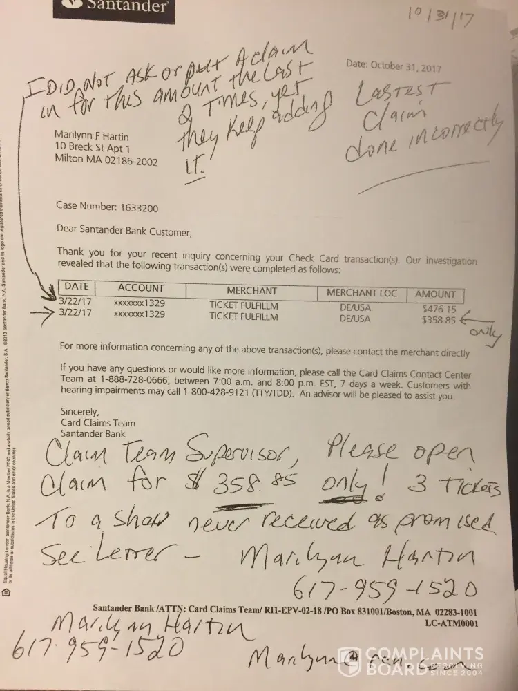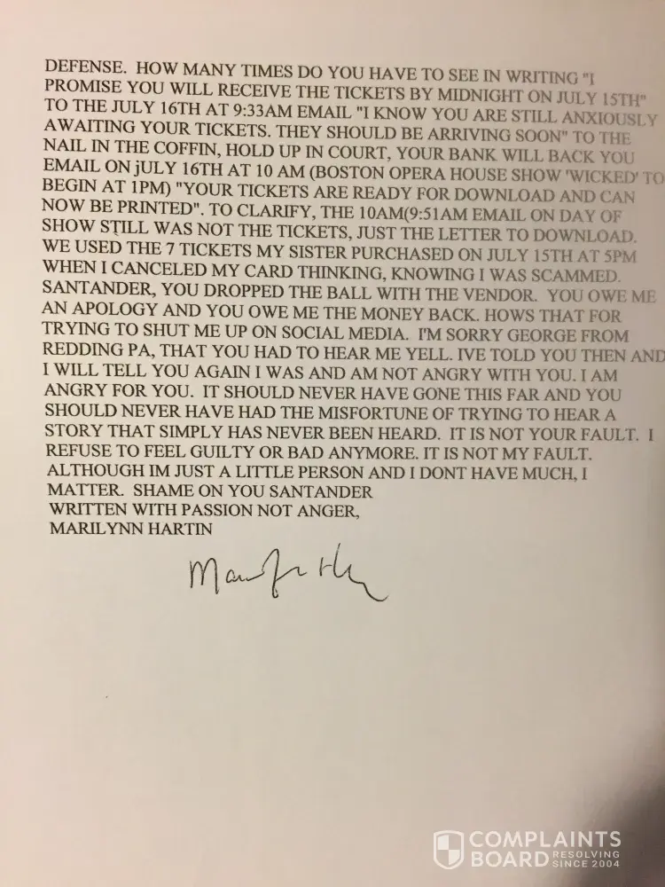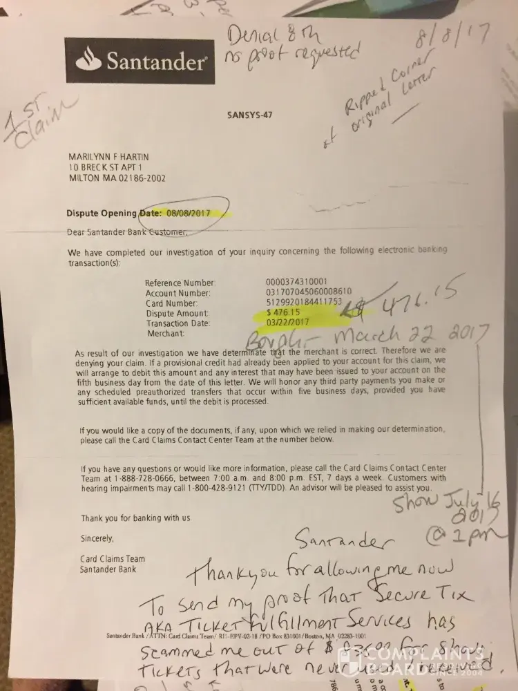 I was now fearfulvthat I was scammed by 'secure Tix' aka 'ticket fulfillment' I saved my pennies to get these girls, in recovery (2 pregnant) to the show of there dreams.! When the other 3 (order 1269913) I looked closer at the 4 tickets. They said ticketMaster, issued to someone else with different seats from what I was told. JULY 15, 2017 at approx 5pm I called Santander crying to cancel my card, that I had been scammed. Oh was desperate and talked with my sister. Diane Thompson my sister, purchased 7 tickets for the show the next day for me! (Ticketmaster: conf# 32-55776/NY2 $1048.90) You'll see in writing my remaining 3 tickets they say are expected to arrive by midnight July 15, 2017. You'll see the promise in email dated July 15, [protected]@5:56 pm. You'll also see email dated July 16, 2017 at 9:33AM telling me they knowing still 'eagerly awaiting', and a final text at 9:51 on Juky 16th, 2017 (Show is July 16 @1pm) stating 'you must download and print out the document.' I'm in Boston! Where! They promised by midnight. The first 3 claims I did included all 7 orders, 2 purchase (466.15 and $358.85) after being denied 3 times, I realized it was only the 3 I didn't get as promised. I bought I was scammed from secure Tix for the 4 as well because they didn't come through for the 3. I have written proof they promised the 3 by midnight July 15, 2007 I requested 2 new claims for ONLY $357.85. (case 1593079 case 1633299) both were wrong and still included the $476.15. I was waiting for ANY response from my faxes(done at branch of MY proof, and my 2 certified letters with my emails and story inside) NOT one of those people called me, responded, cared about anything I was telling them. No one knew where my letters went (40 pages) nooone knew or cared where faxes went. I was Promised over and over I would get a call! Branch mgr in Milton spoke to claims 4 times and emailed a Sebastian that promised me yet again, through store mgr he would call. Nothing. Not a word. Santander pops up on my fb page. I write complaint. George freely pm'dme. Said he'd call the next day. I had hole again that I would see my $358.85 (paying my sister back still) he listened while I vented at the end I thanked him. He stopped and said he just put the claim in again for me! I asked him for what? He actually told me 'for 476.15 and 357.85' I started crying and yelling. He gave me hope but listen to a word I said. I only want what they promised and failed to do. That promise in writing would hold up In court for Gods Sake! George then said that the vendor sent proof tickets were sent! I reminded him of the promise in writing and the email the day of the show at 9:51am (not even tickets: they still need downloading) George told me 'BECAUSE THE VENDOR DIDNT PAY US & SENT PROOF, WE CANT PAY YOU!'. I'm the little guy that doesn't matter to Santander. You should stand by your customer. I will continue to talkvand write about this until I get what was promised tickets for 3 by secure Tix sent before midnight in July 15th, 2017 I would like my $358.85 back. I don't care that secure Tix thinks they're right. They have a promise in writing. they failed to come through and Santander needs to stand up for me. Claims Dept never wrote notes so the next I called over time had a clue as to what was going on. The last 2 claims I requested be for only $358.85 and they still got that wrong. No one knew where my 2 over 30 page faxes went (bank mgr got # from claims Dept) or where MY PROOF IN 2 certified letters went. (Address bank manager got for me to MAKE SURE MY PROOF WOULD BE HEARD.